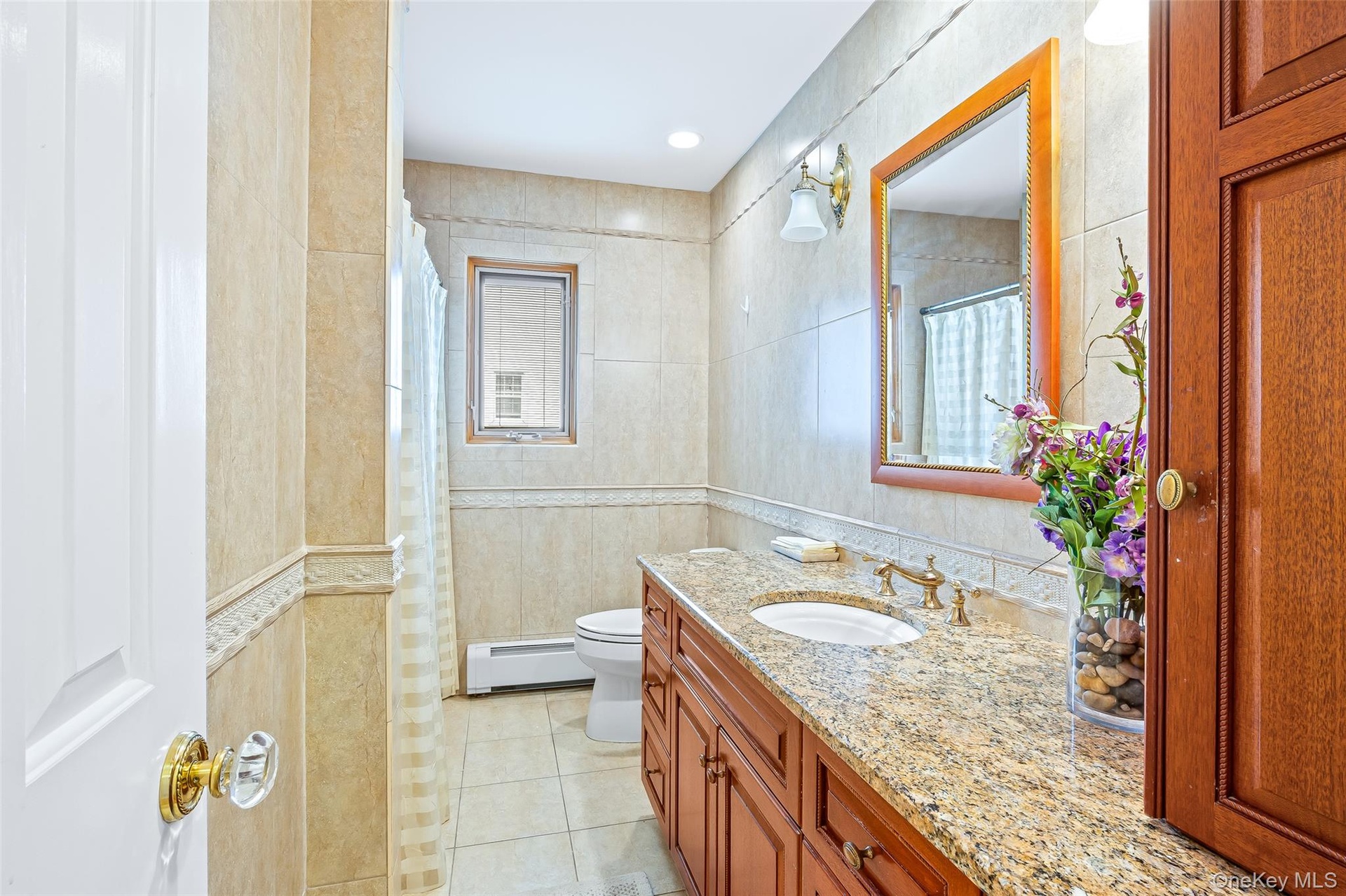 - Full bath featuring tile walls, vanity, light tile patterned floors, baseboard heating, and a stall shower