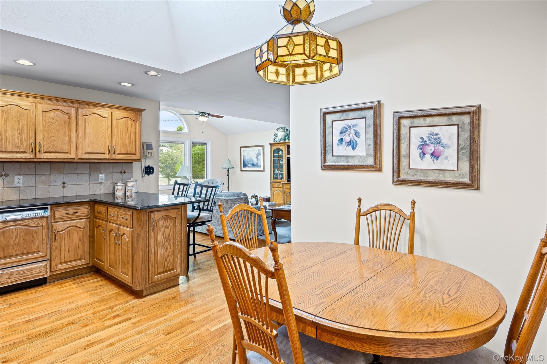 - Dining area with recessed lighting, light wood finished floors, ceiling fan, and vaulted ceiling