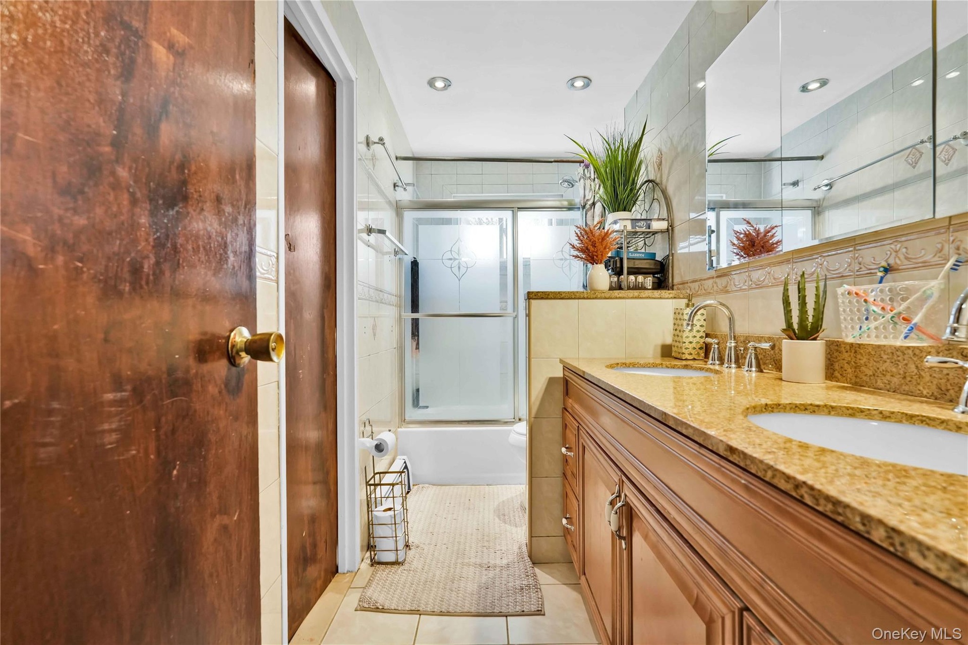 - Bathroom featuring combined bath / shower with glass door, light tile patterned floors, double vanity, tile walls, and recessed lighting