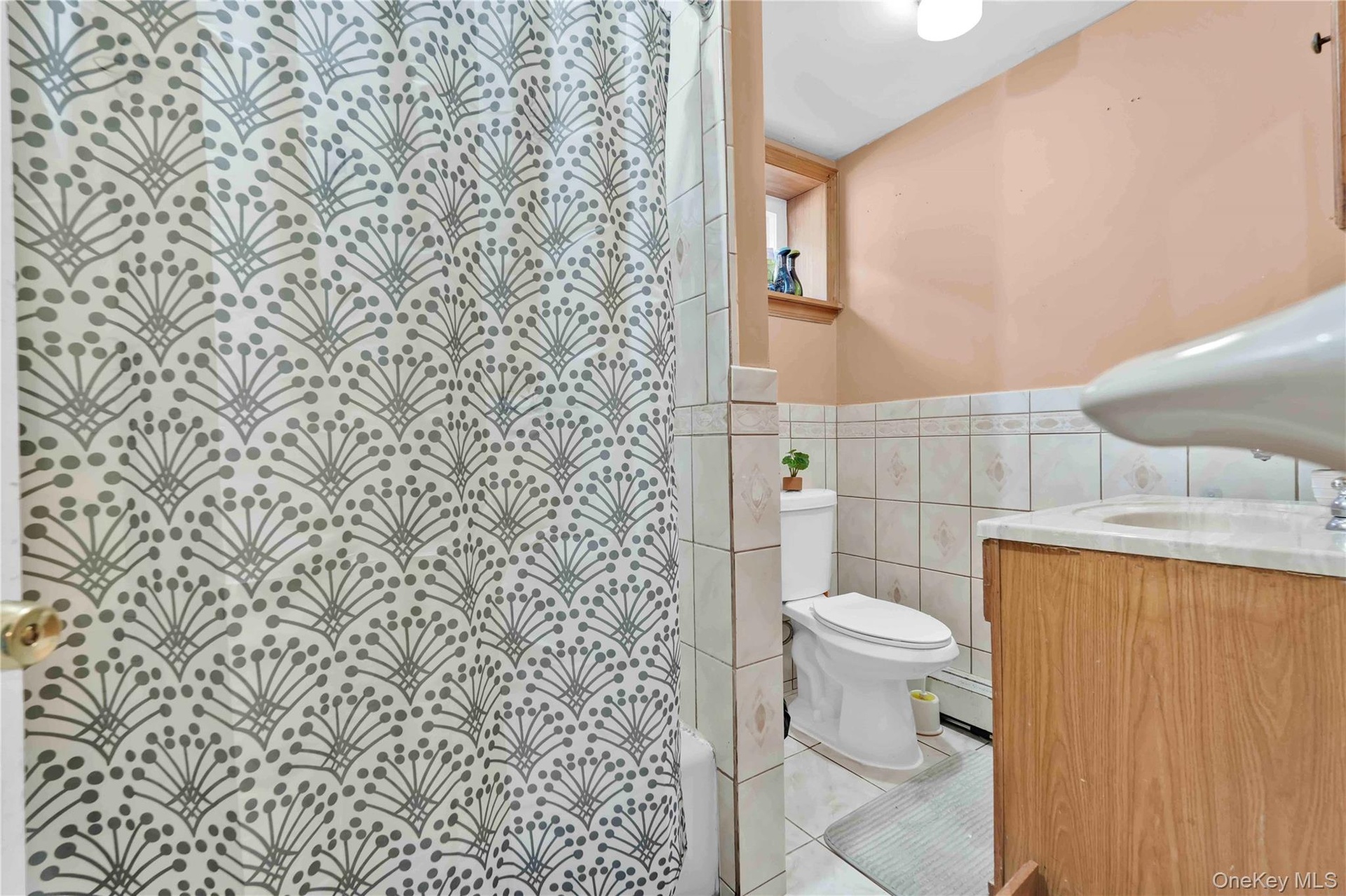 - Full bathroom with tile patterned floors, tile walls, vanity, a baseboard heating unit, and wainscoting