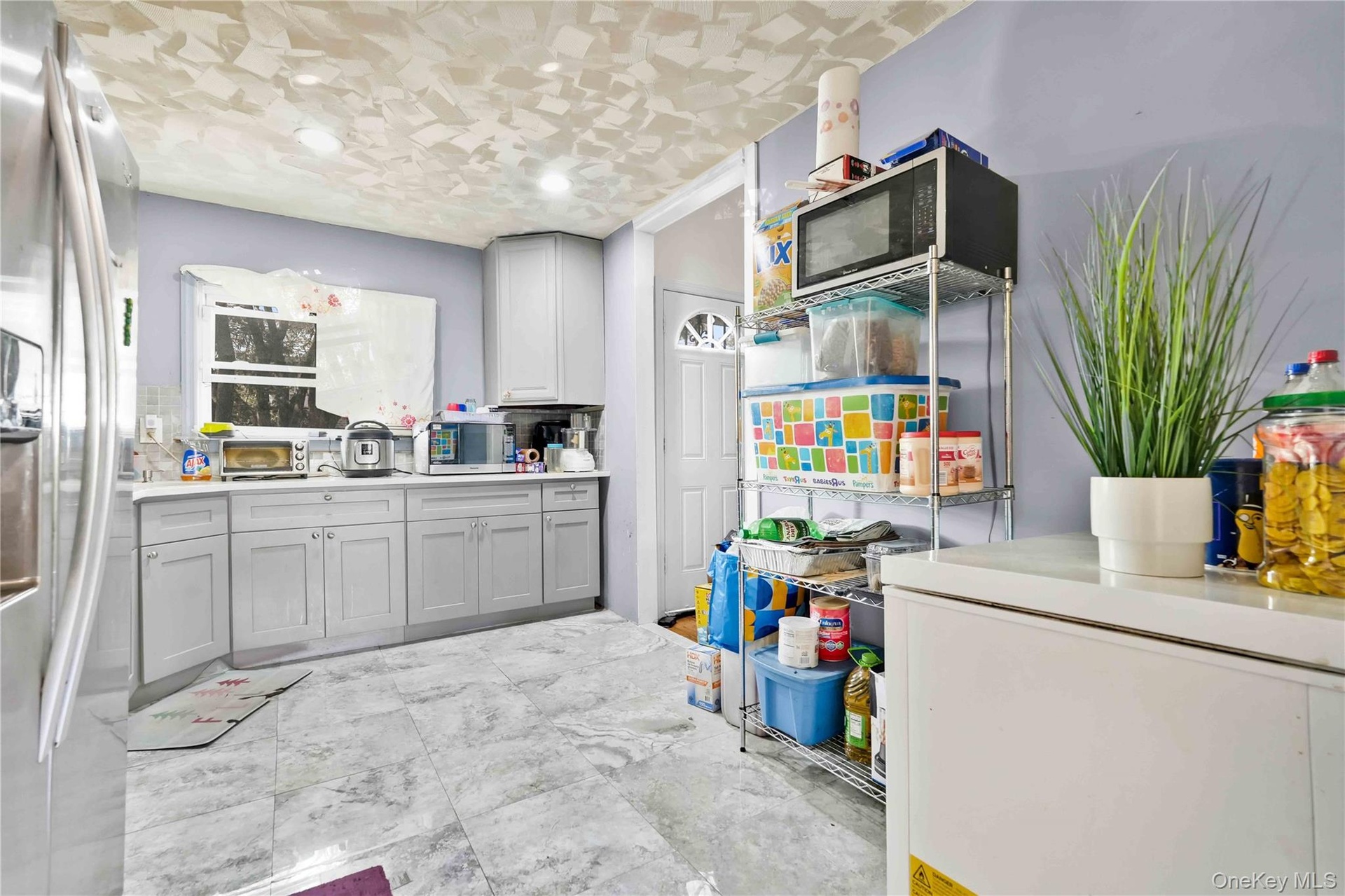 - Kitchen featuring appliances with stainless steel finishes, gray cabinetry, light countertops, and tasteful backsplash