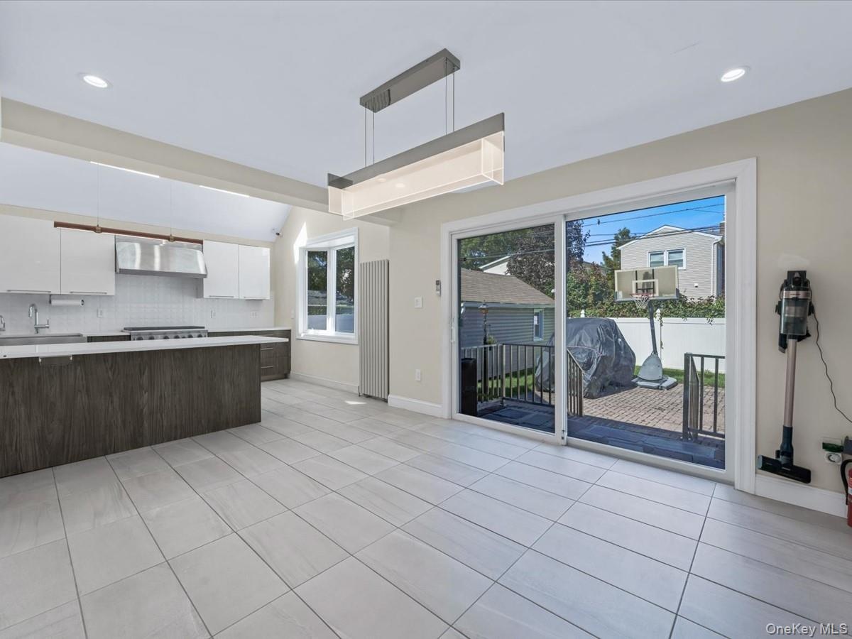 - Bakyard view from Kit POV with white cabinets, dark brown cabinetry, light countertops, light tile patterned flooring, and under cabinet range hood