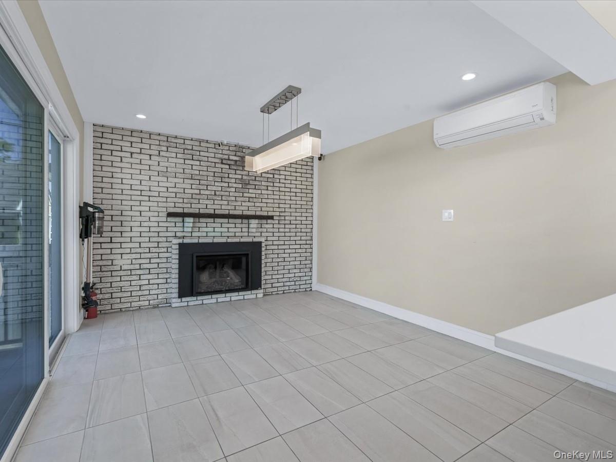* Adjoining dining/family room featuring a brick fireplace, sliding doors to a private paver patio and fenced backyard, ideal for entertaining