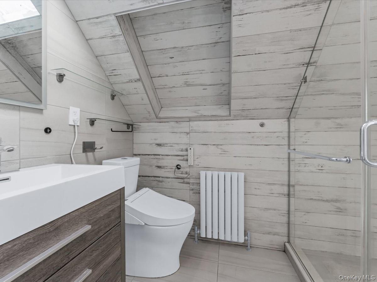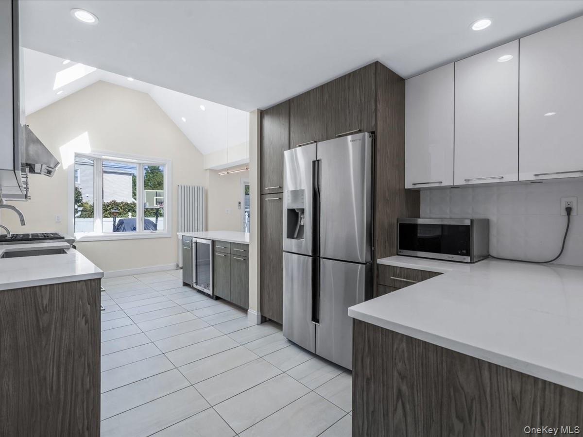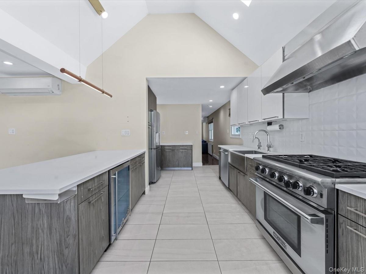 * Sleek chef’s kitchen with vaulted skylight ceiling, quartz counters, farmhouse sink, and professional appliances