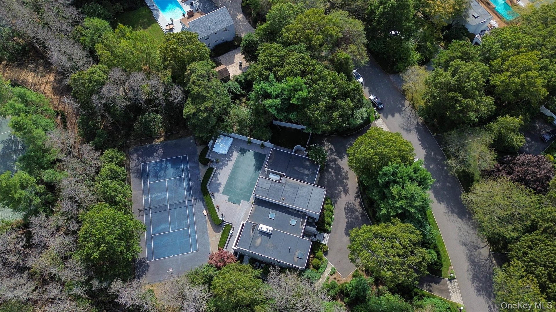Tucked away on a peaceful lane is this beautifully updated contemporary that optimizes country living in the Hamptons. Set back and nestled on a professionally landscaped property you enter the home via double etched-glass door that lead to the great room with walls of glass that bring in great light and the stunning outdoor vista. There are 4 sets of double sliding glass doors that open out to the deck. The great room encompasses the living room with built-ins and granite-clad fireplace, double height ceiling with skylight and is open to the sun-flooded dining room and the chef's kitchen. The kitchen features abundant cabinetry, Corian counters, stainless steel appliances and island with seating, sink, dishwasher and more storage cabinetry. The versatile first floor layout could accommodate 2 private home offices and 2 bedrooms or, if needed on this first level, 4 bedrooms. There are two en-suite bedrooms, with walk-in closets, and two more bedrooms and full hall bath. Completing the first floor is a guest powder room, full laundry room and entry to the 2-car attached garage. A separate staircase leads to 2 bedrooms and a full hall bath. Up the main staircase to a private primary suite that includes bedroom with fireplace, bath with soaker tub and sliders to a private deck. The party-sized full, finished basement features a home theater, full wet-bar with an ice-maker, bar-sink, refrigerator and seating. There is a separate nook for a pool table, a gym with full mirrored wall, storage galore, cedar closet, an outside entrance and space for a full bath. The property is enhanced with outdoor custom lighting, Belgium-block lined circular drive, heated saltwater 20 x 40 vinyl in-ground pool, tennis court and a large deck that can handle any summer get-together. There is an outdoor kitchen with BBQ, sink and fridge, covered dining and bar, built-in seating around the deck, and after that set of tennis or dip in the pool use the convenient outdoor shower. No summer crowds, just the perfect place to call home and unwind from the hustle and bustle of everyday living. You are surrounded by nature, protected farmland and open spaces, yet minutes from Westhampton Village, local schools, clubs, world renowned beaches and everything that the Hamptons has to offer.