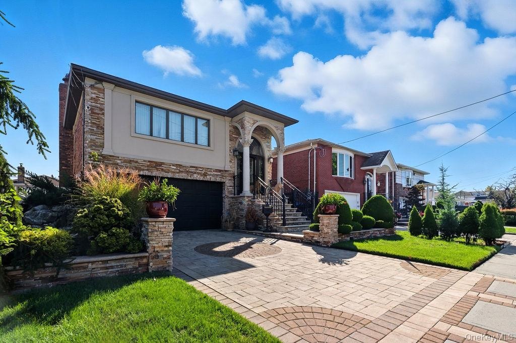 - View of front facade featuring decorative driveway, stone siding, an attached garage, and a front yard
