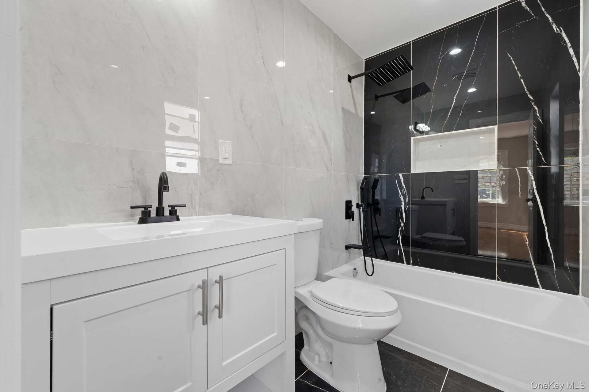 - Full bath featuring washtub / shower combination, vanity, and tile walls