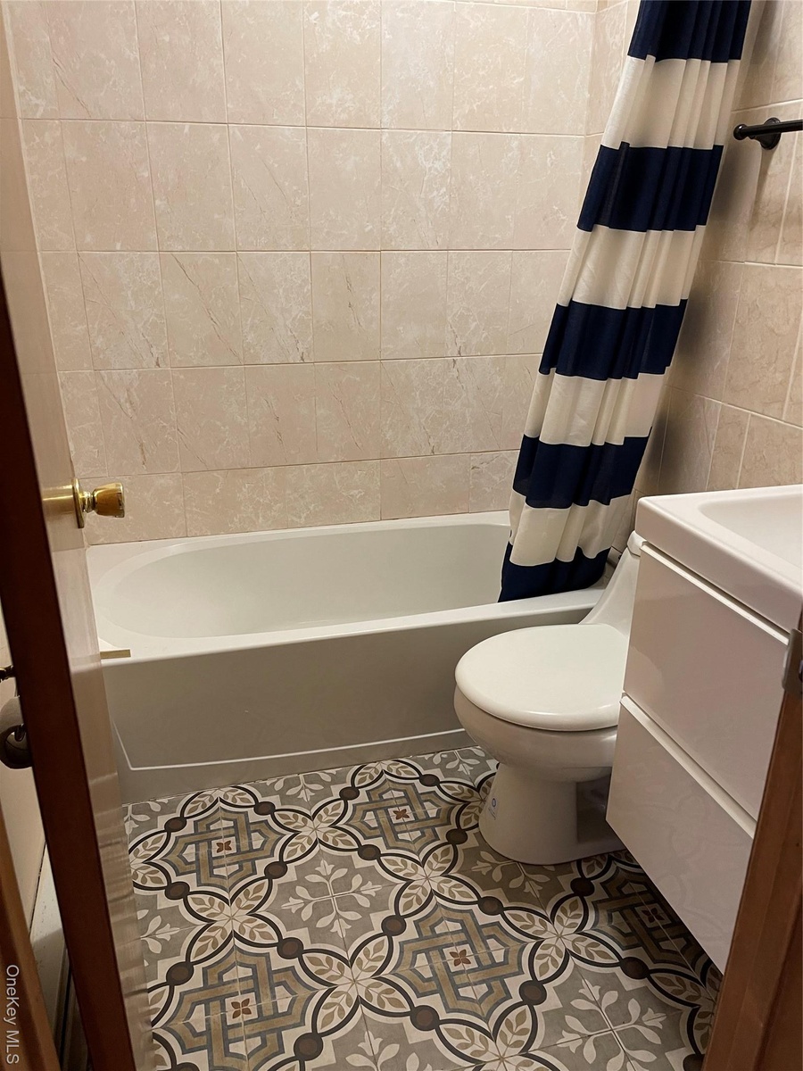 - Bathroom featuring vanity, shower / tub combo, tile patterned flooring, and tile walls