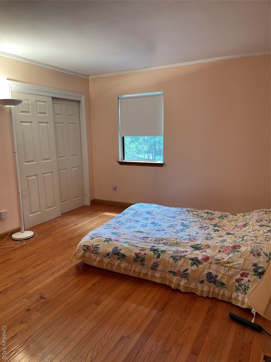 - Bedroom featuring crown molding, light wood-style floors, and a closet