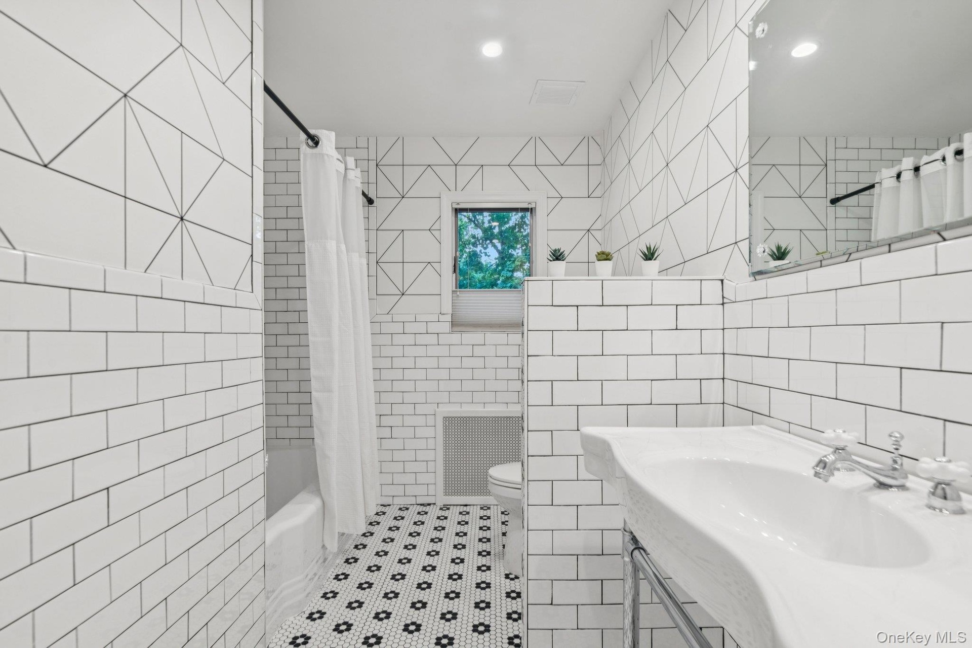 - Full bath featuring shower / tub combo with curtain, tile walls, vanity, recessed lighting, and tile patterned floors