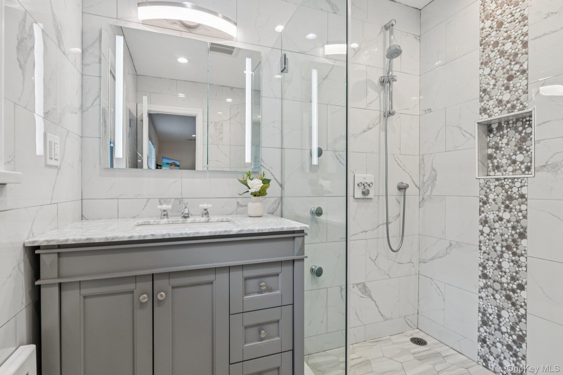 - Bathroom featuring vanity, a walk in shower, and tile walls
