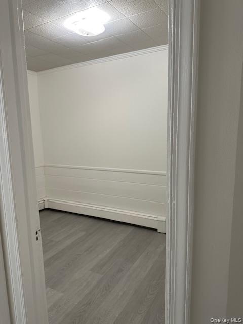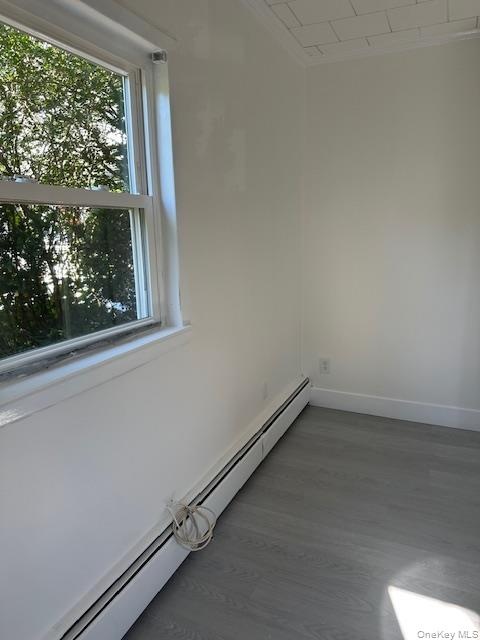 - Spare room featuring ornamental molding, wood finished floors, and a baseboard radiator