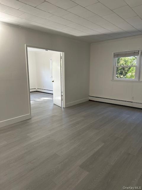 - Spare room with dark wood-style floors, ornamental molding, and baseboard heating