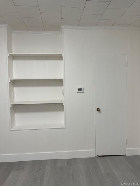 - Unfurnished living room with dark wood-style flooring, built in shelves, and crown molding