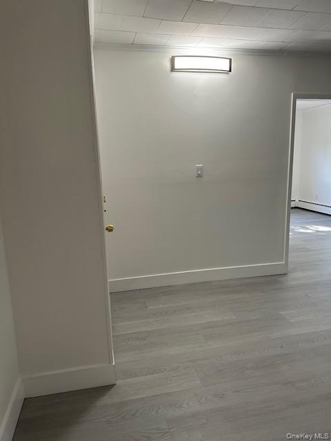 - Unfurnished room featuring light wood-style flooring and baseboard heating
