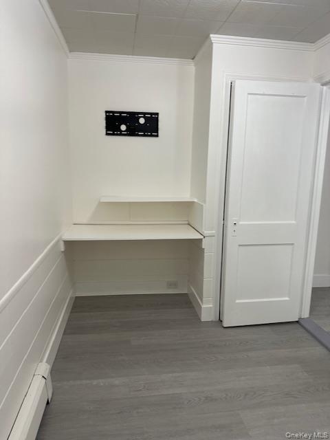 - Spare room featuring dark wood finished floors, ornamental molding, and baseboard heating