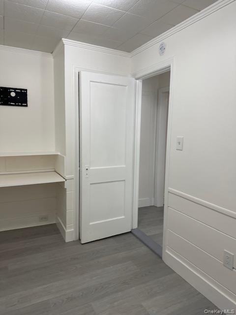 - Unfurnished dining area with ornamental molding and dark wood finished floors