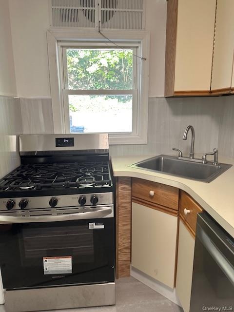 - Kitchen featuring stainless steel range with gas stovetop, light countertops, and brown cabinetry