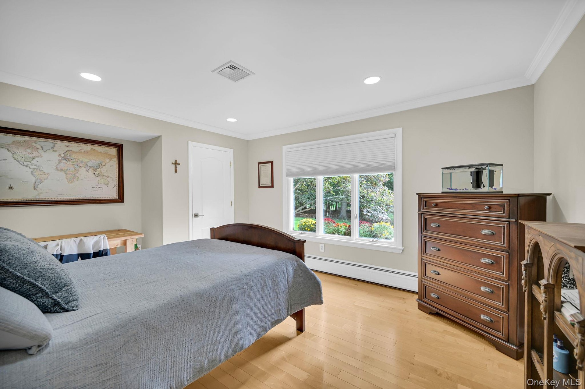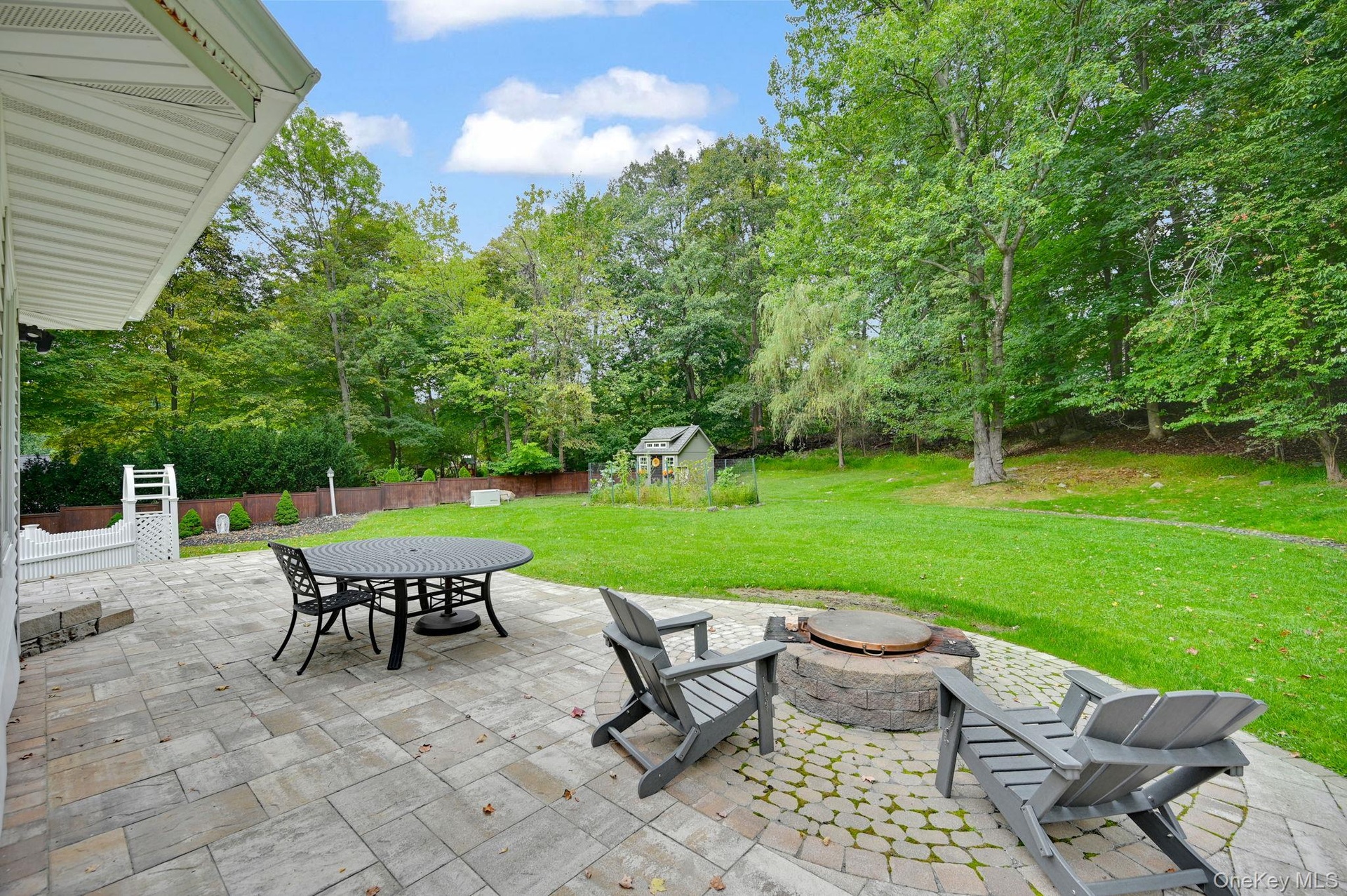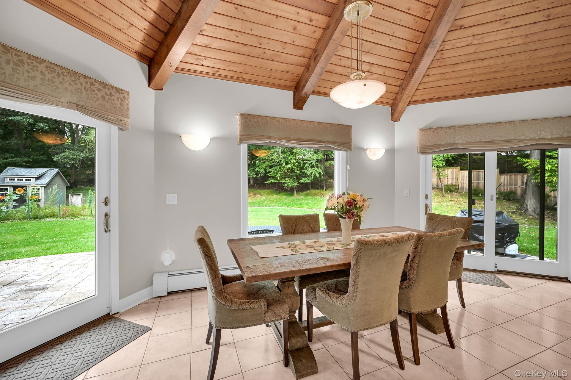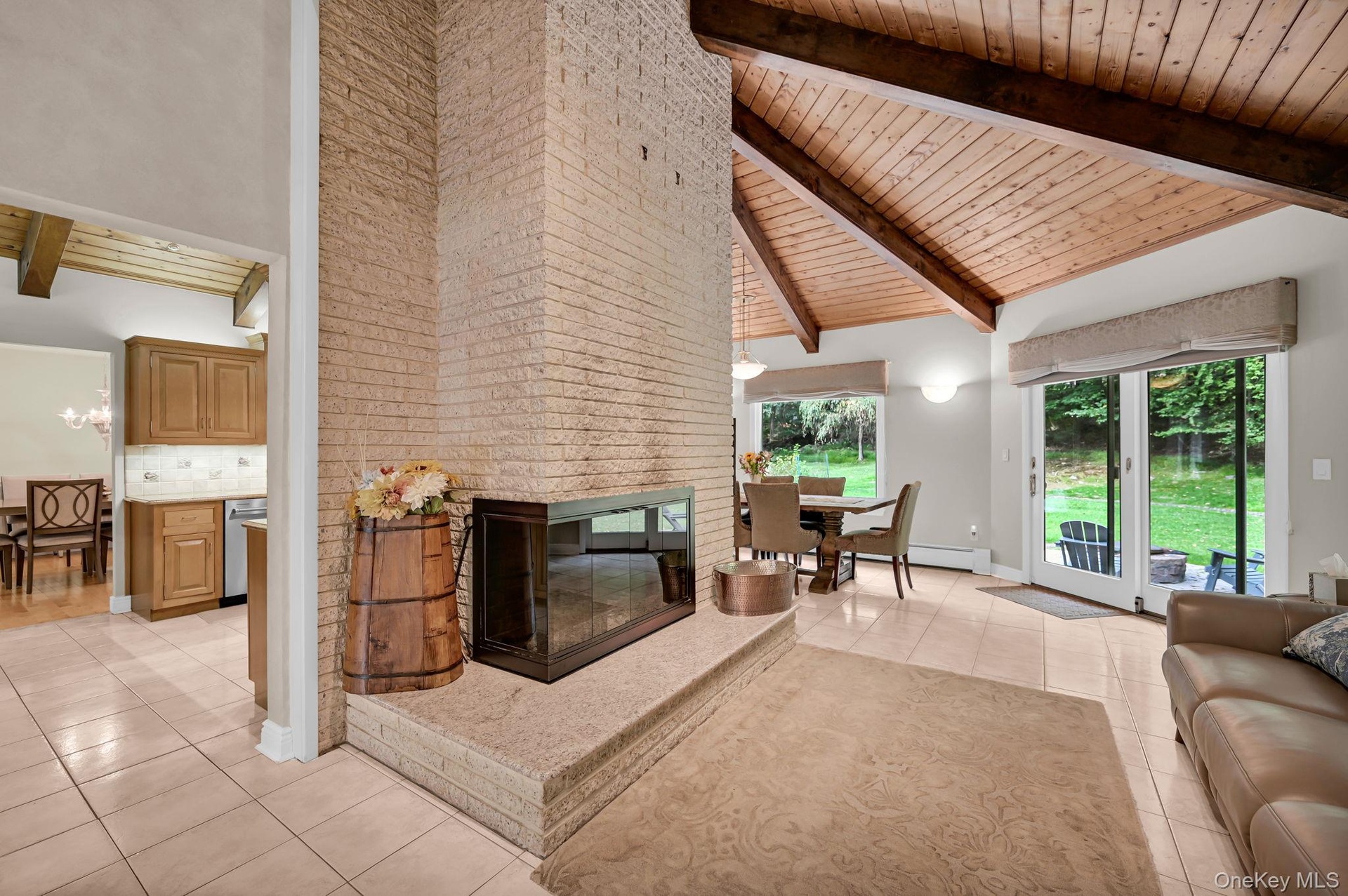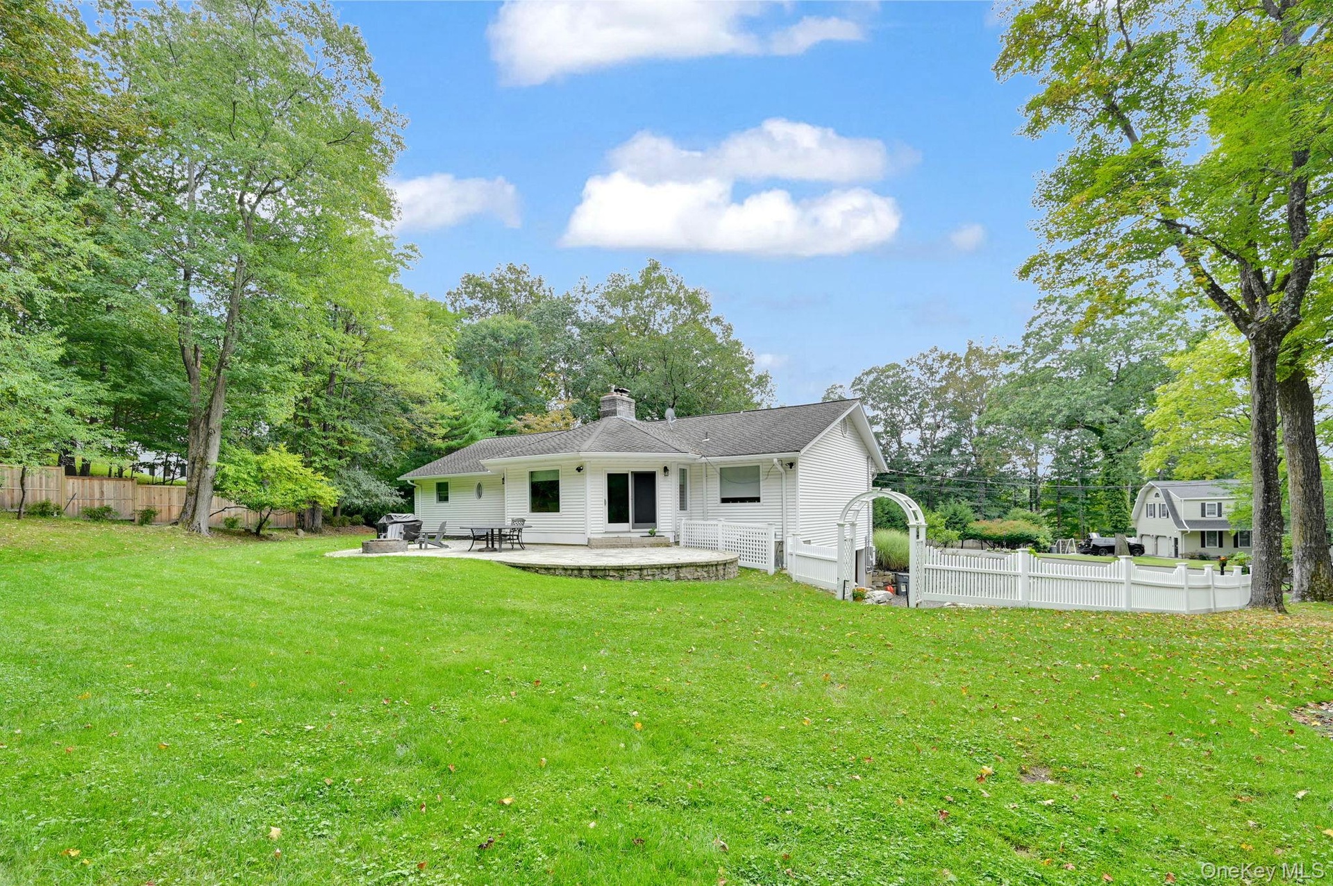 Stunning Ranch on picturesque 3/4 acre property on quiet cul-de-sac. Welcome to this immaculate 3-bedroom, 3-bathroom ranch, a perfect blend of classic style and modern comfort. Step into the entry foyer which leads to a bright, sun-drenched Living Room and an elegant Dining Room, both featuring gleaming hardwood floors. The heart of the home is the expansive Vaulted Family Room, distinguished by a dramatic floor-to-ceiling brick fireplace and beautiful beamed wood ceilings, creating a warm, inviting atmosphere perfect for gathering. Glass sliders lead directly to the serene backyard oasis. The adjacent gourmet Kitchen boasts custom cabinetry, granite countertops, stainless steel appliances, and a charming dining area, all under another striking vaulted, beamed ceiling.