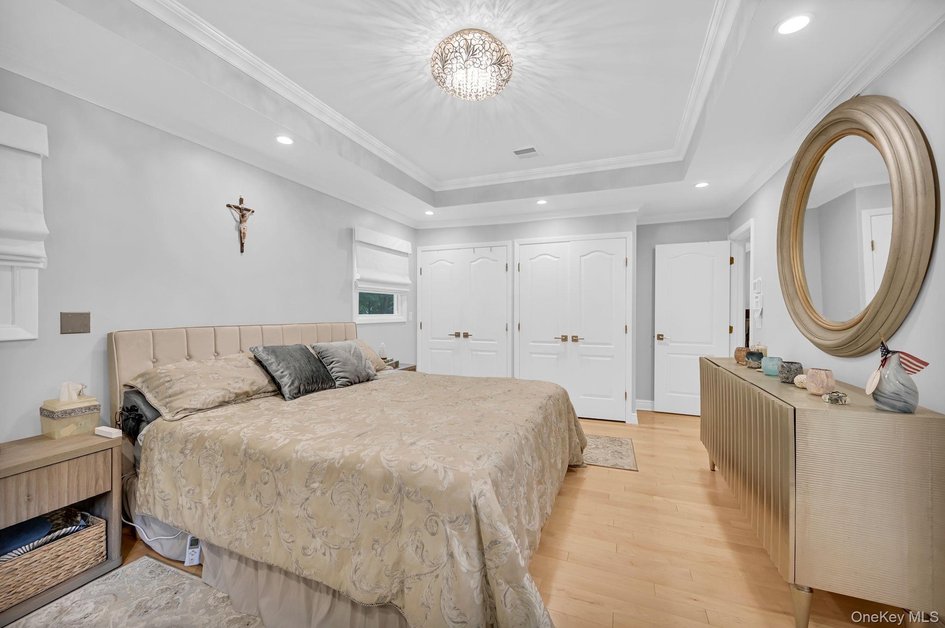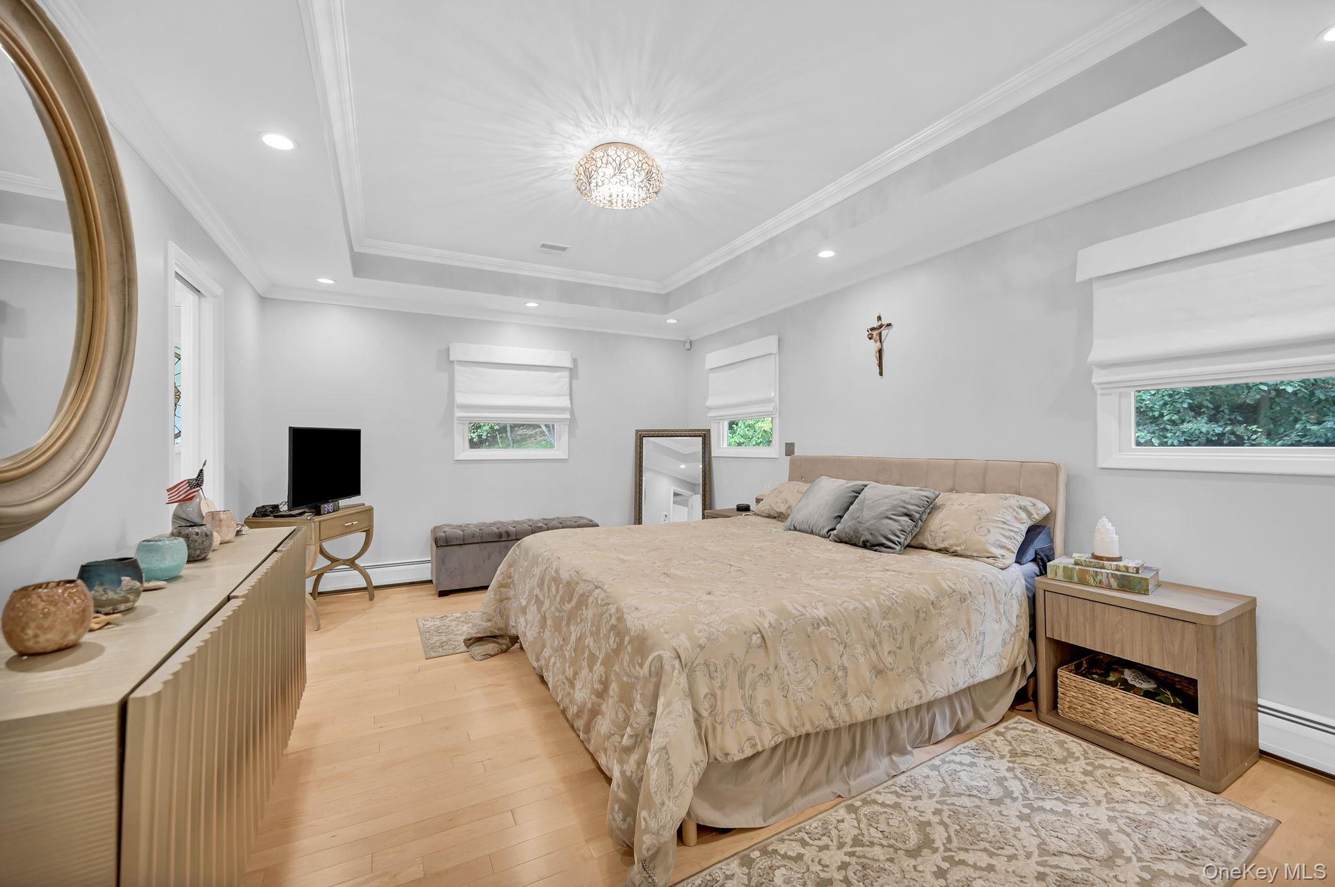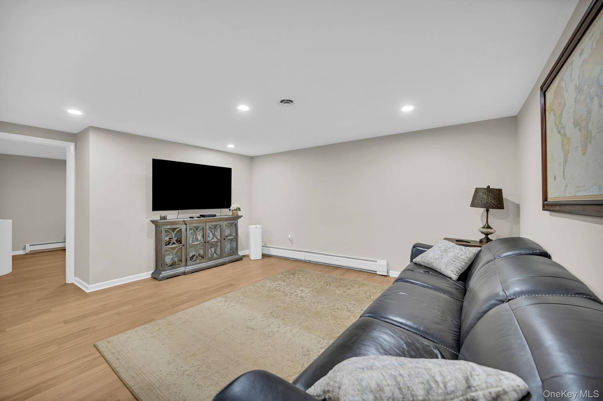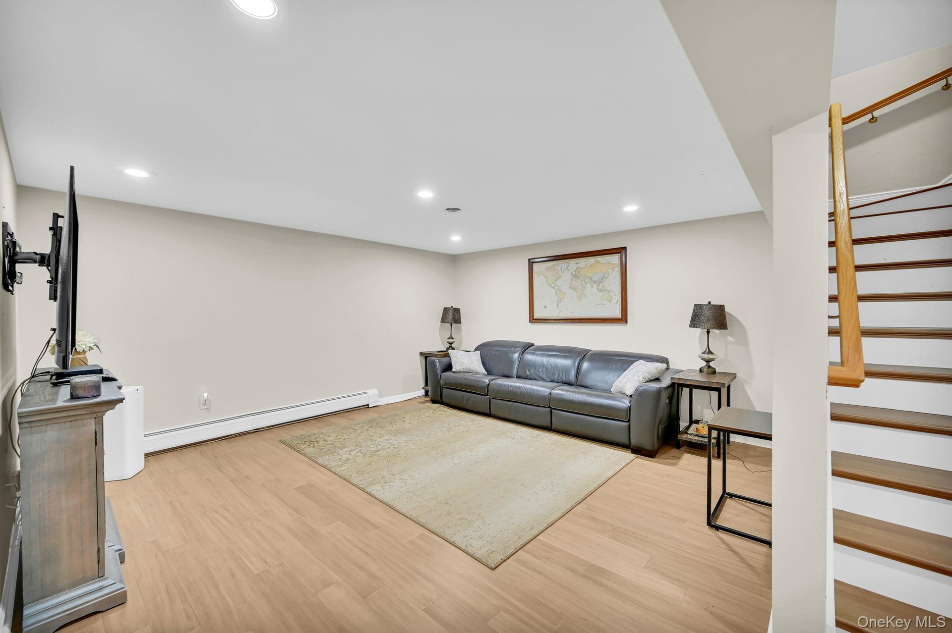 Stunning Ranch on picturesque 3/4 acre property on quiet cul-de-sac. Welcome to this immaculate 3-bedroom, 3-bathroom ranch, a perfect blend of classic style and modern comfort. Step into the entry foyer which leads to a bright, sun-drenched Living Room and an elegant Dining Room, both featuring gleaming hardwood floors. The heart of the home is the expansive Vaulted Family Room, distinguished by a dramatic floor-to-ceiling brick fireplace and beautiful beamed wood ceilings, creating a warm, inviting atmosphere perfect for gathering. Glass sliders lead directly to the serene backyard oasis. The adjacent gourmet Kitchen boasts custom cabinetry, granite countertops, stainless steel appliances, and a charming dining area, all under another striking vaulted, beamed ceiling.