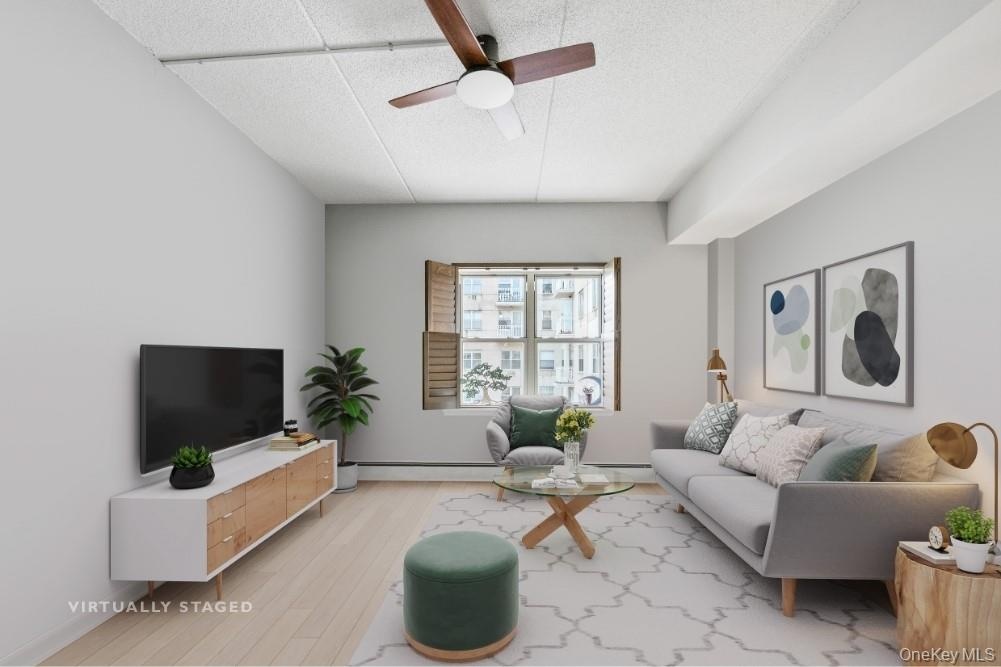- Living area with light wood-type flooring, ceiling fan, and a baseboard heating unit