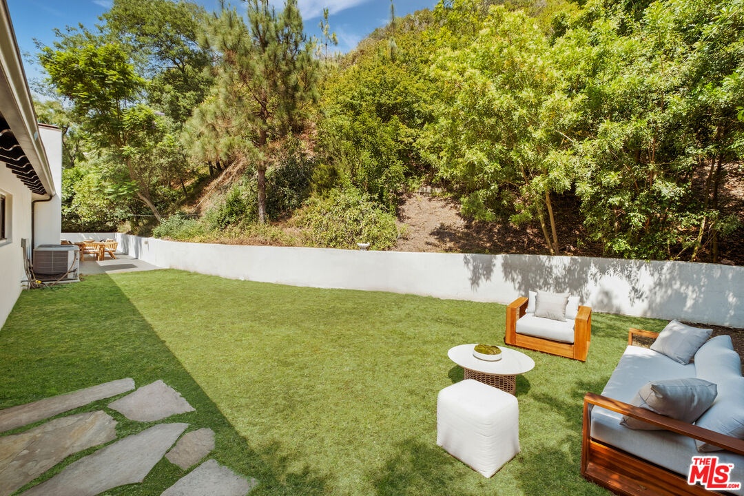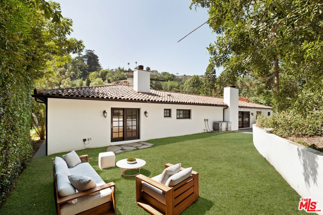 Nestled in a lush canyon in lower Bel Air, and one of the most charming homes on the street, 1132 Chantilly Rd is a single-level, turnkey home featuring three bedrooms and three bathrooms. Set above the street with striking black double front doors, wrought iron lanterns, a brick stairway leads to a covered entry framed in white stone. A wood-burning fireplace anchors the living room, which connects to a dining area that opens to the outdoor terrace through French doors. The kitchen includes Wolf appliances, stone countertops, generous storage, a breakfast nook, and a window-lined area ideally suited for a coffee corner. The primary suite includes its own fireplace, walk-in closet, seating area, and direct access to a private backyard. The en-suite bath features limestone finishes, dual vanities, a soaking tub, and a steam shower with dual heads. Two additional en-suite bedrooms are positioned to bring in natural light through well-placed windows. Surrounded by mature greenery, the outdoor areas offer multiple spaces for lounging and alfresco dining. A compelling offering in lower Bel Air, where location, size, and quality rarely align at this price point.