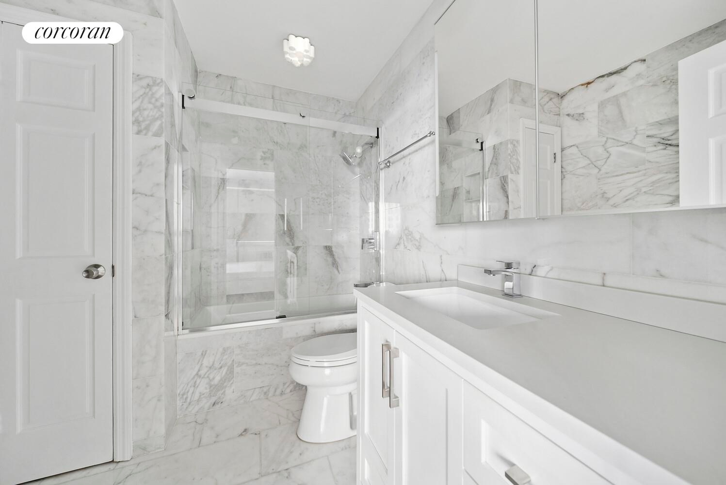 With a wall of windows, there is great natural light throughout the day. Apartment 8K underwent a complete gut renovation in the past five years, with no detail omitted. The stunning kitchen, with quartz counter-tops and stainless steel appliances matches the equally well designed marble bathroom, which has a linen closet, plus a large nook that can potentially be turned into another closet. There is great closet space, in addition to a gorgeous quartz custom built in dresser for even more storage! Enjoy peace and tranquility here, thanks to City Quiet windows.