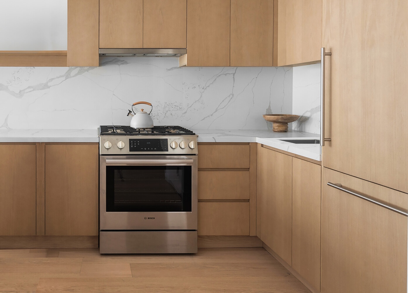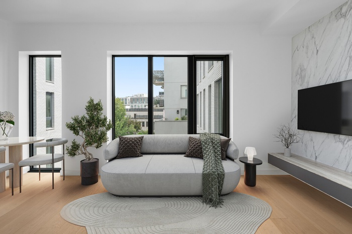 A thoughtful open-concept layout is anchored by wide, 8-inch oak plank flooring and enhanced by a smart climate system, Latch keyless entry, and an in-unit washer and dryer for effortless modern comfort. The top-of-the-line custom German kitchen is both sleek and functional, equipped with integrated Bloomberg appliances, quartz countertops and backsplashes, Grohe fixtures, and soft-close wood cabinetry and drawers. The spa-like bathroom blends timeless materials with contemporary style, showcasing Bardiglio Versilis marble, a custom oak vanity, Duravit floating toilet, and polished chrome fixtures by Grohe, Toto, and Hansgrohe.