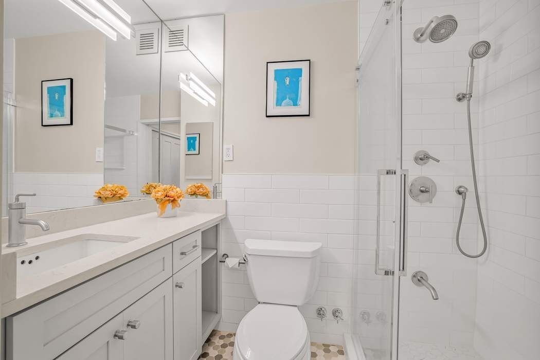 - Renovated bathroom includes a large walk-in shower and contemporary fixtures.
