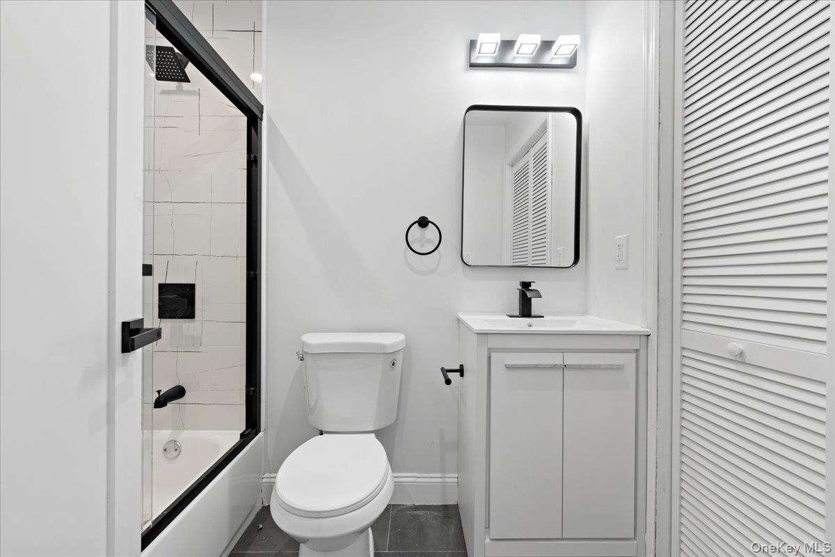 - Full bath featuring a closet, vanity, shower / bath combination with glass door, and dark tile patterned flooring