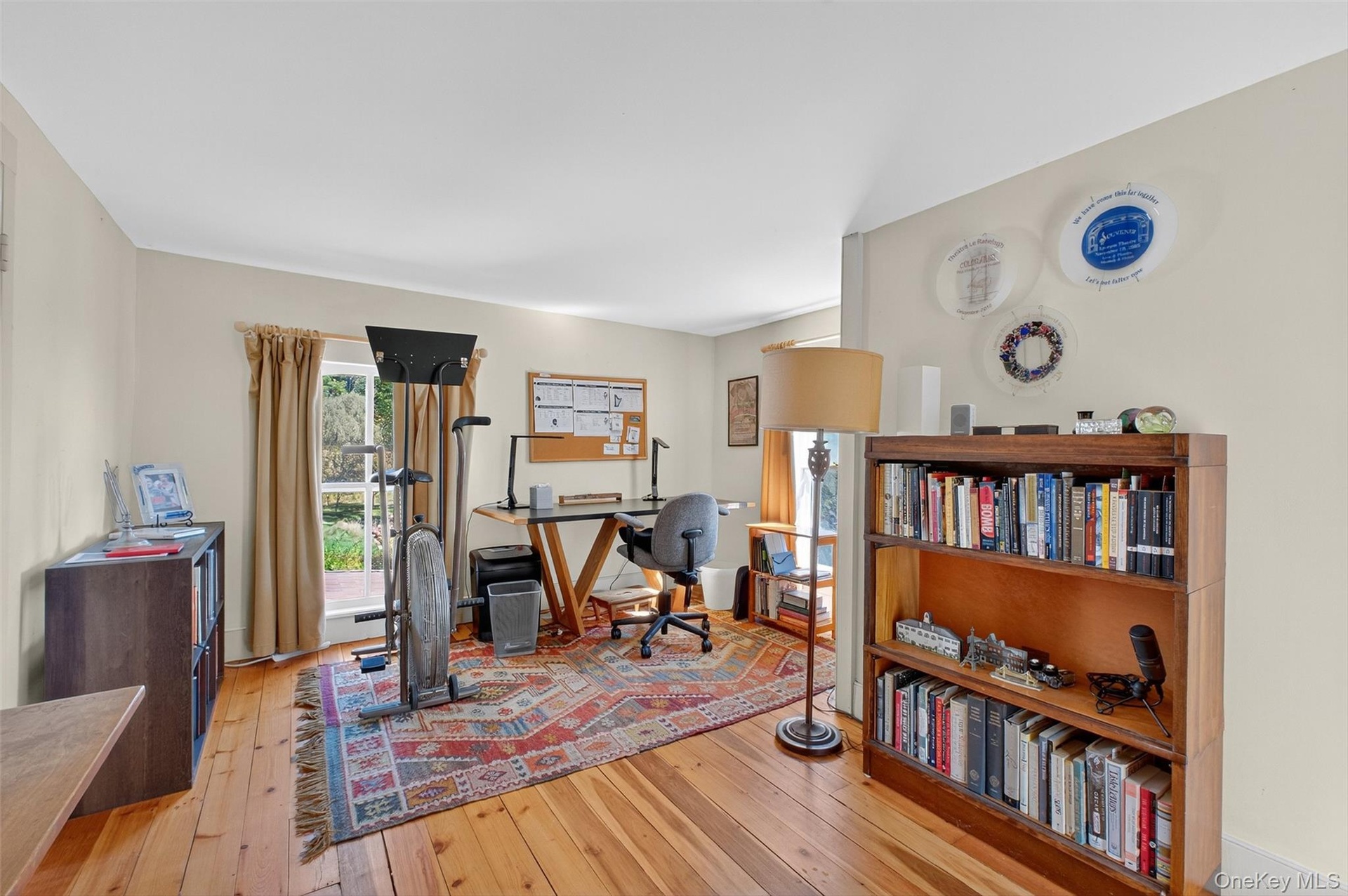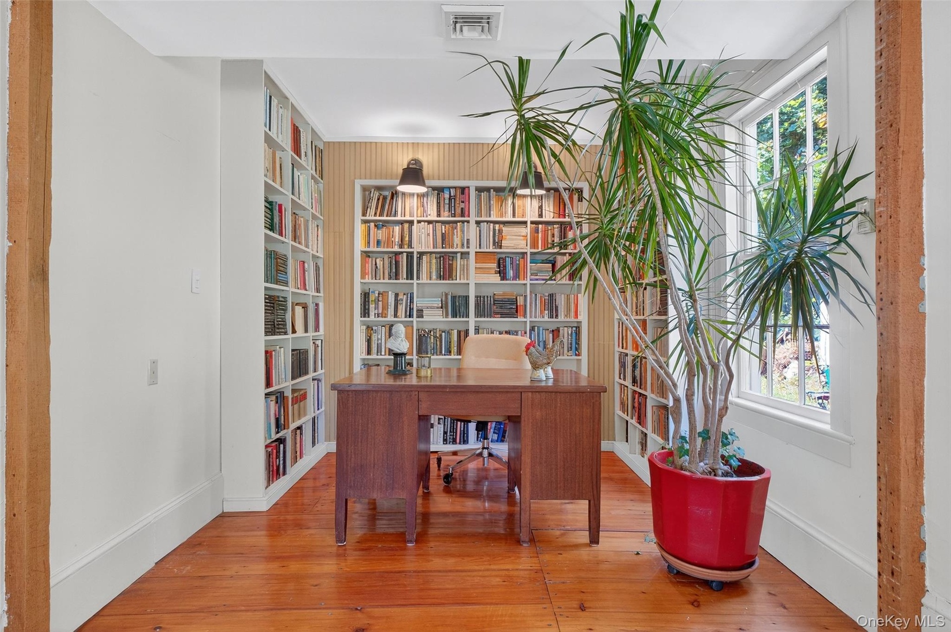 Light-filled interiors feature unusually high ceilings [on the main level] for its era, hand-cut oak and hemlock beams, and a spacious living room anchored by a cast-iron stove. A versatile main-level suite with private entrance and bath access works beautifully as a guest or in-law suite, or even a separate workspace.