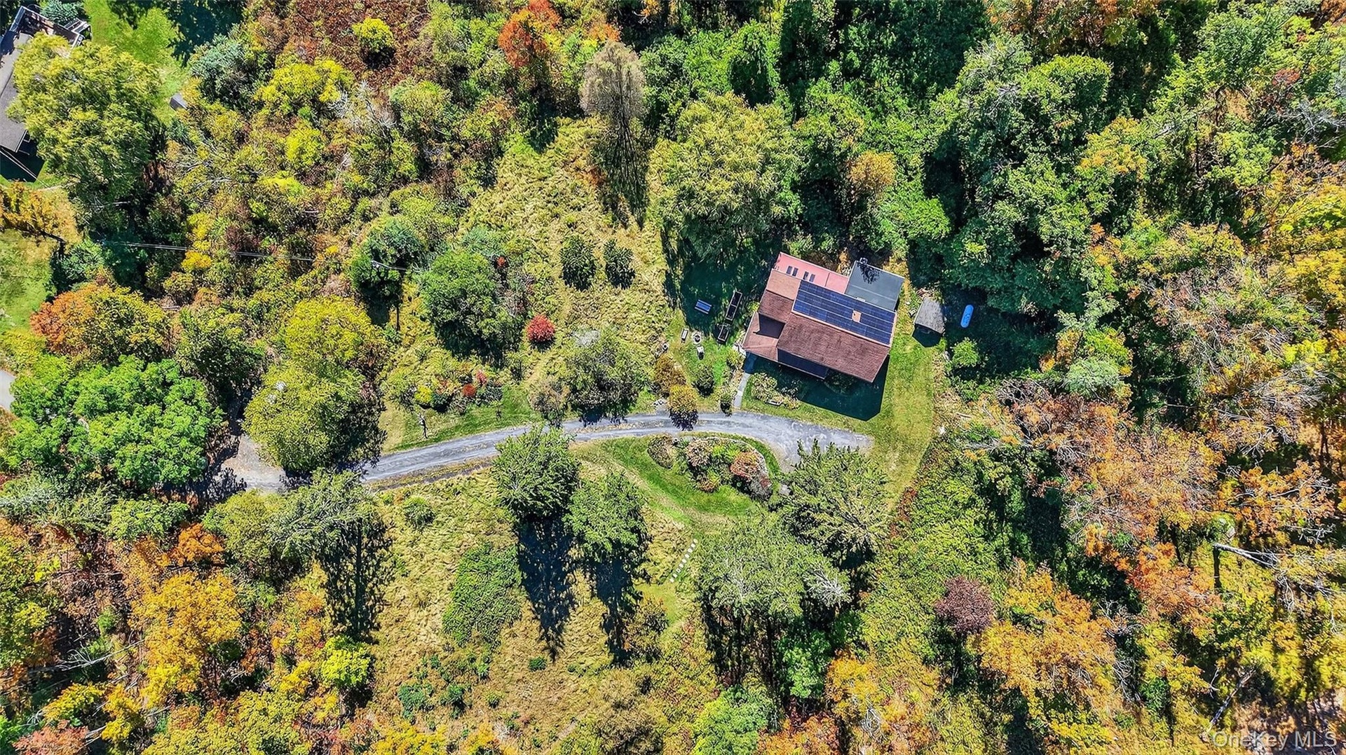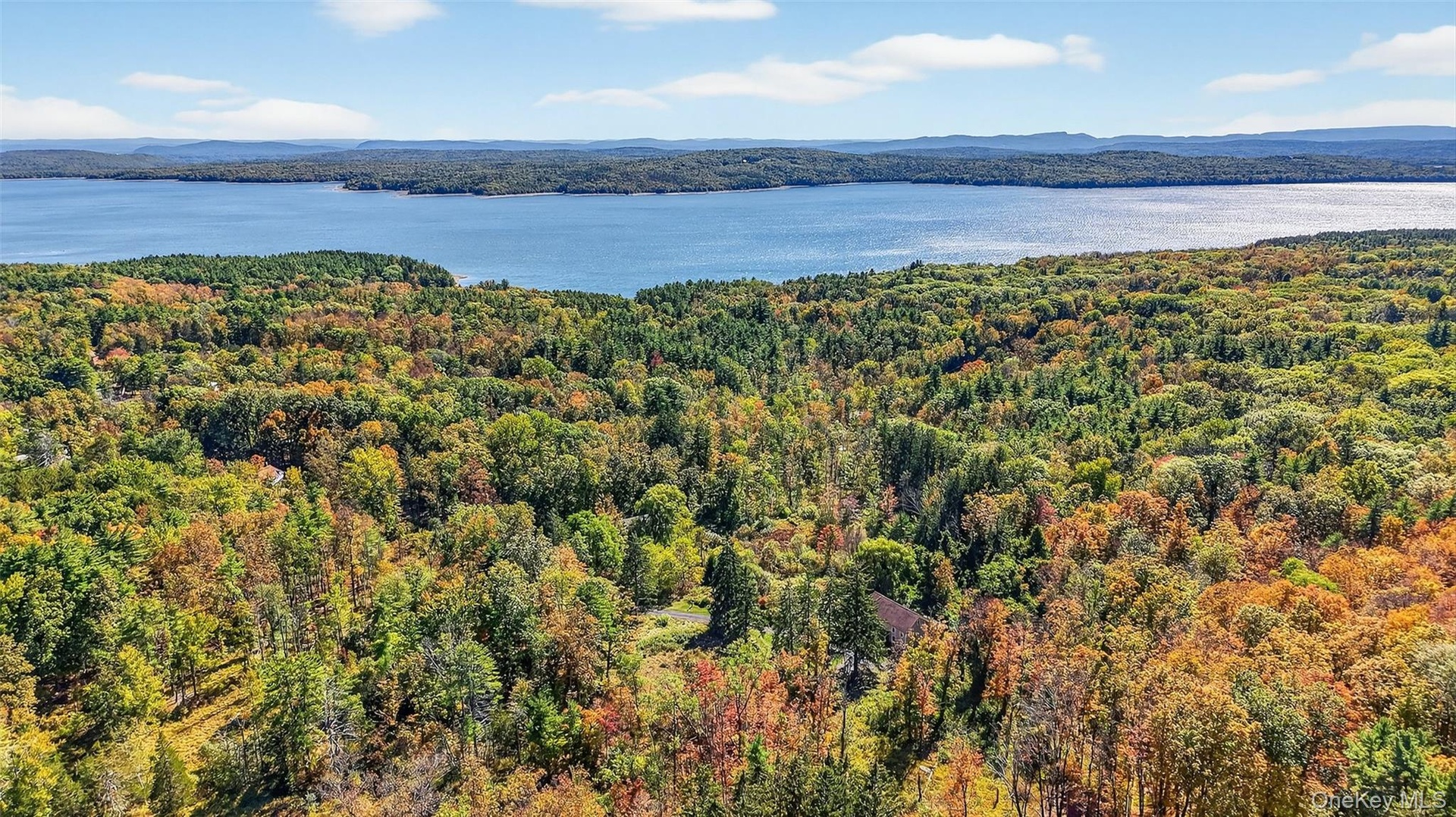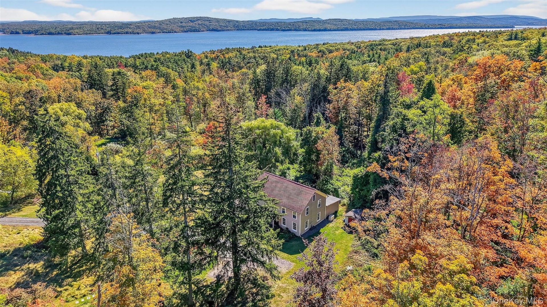 - Aerial view of property and surrounding area with a heavily wooded area and a large body of water