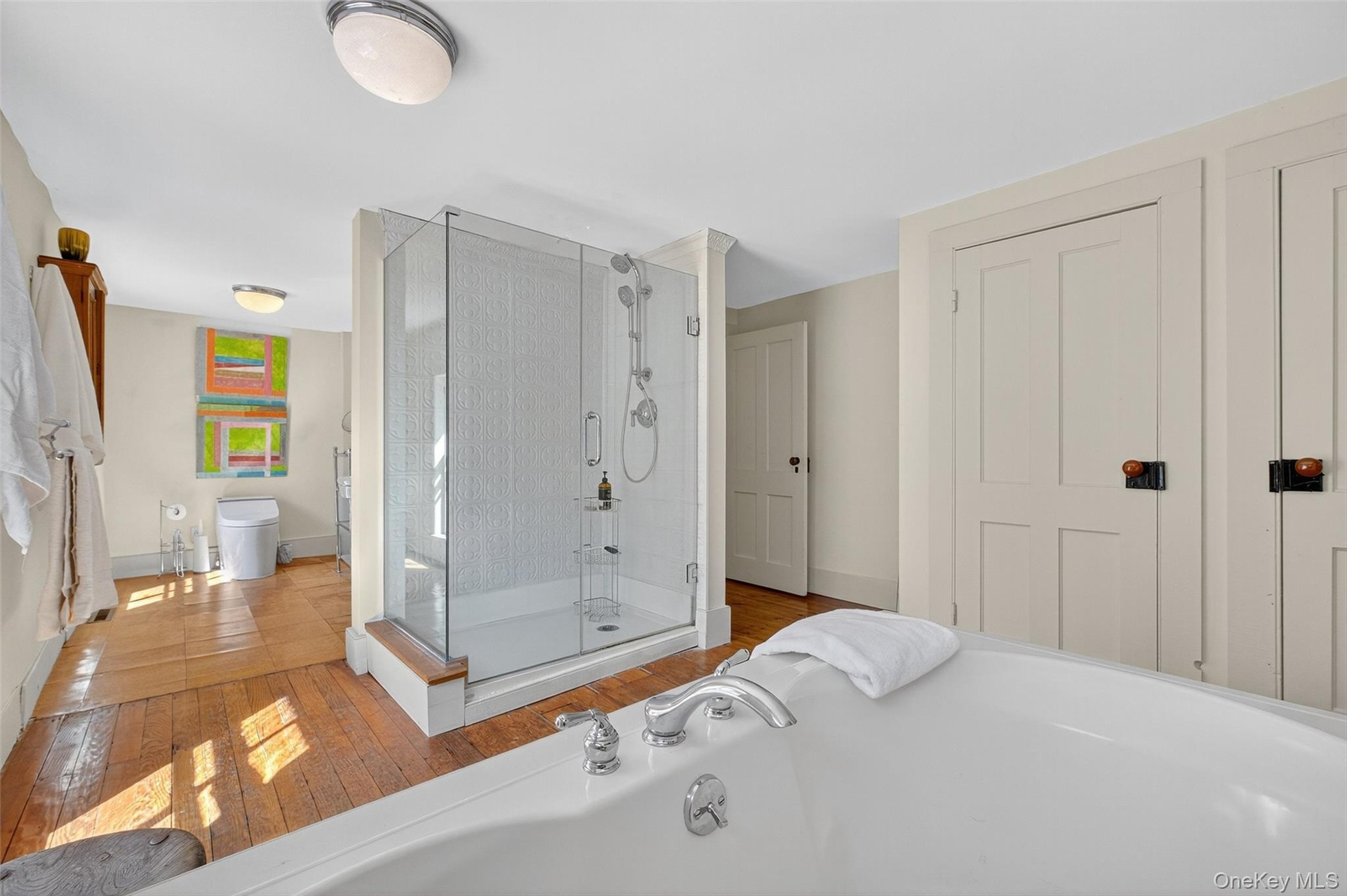 - Bathroom with hardwood / wood-style flooring, a stall shower, and a garden tub