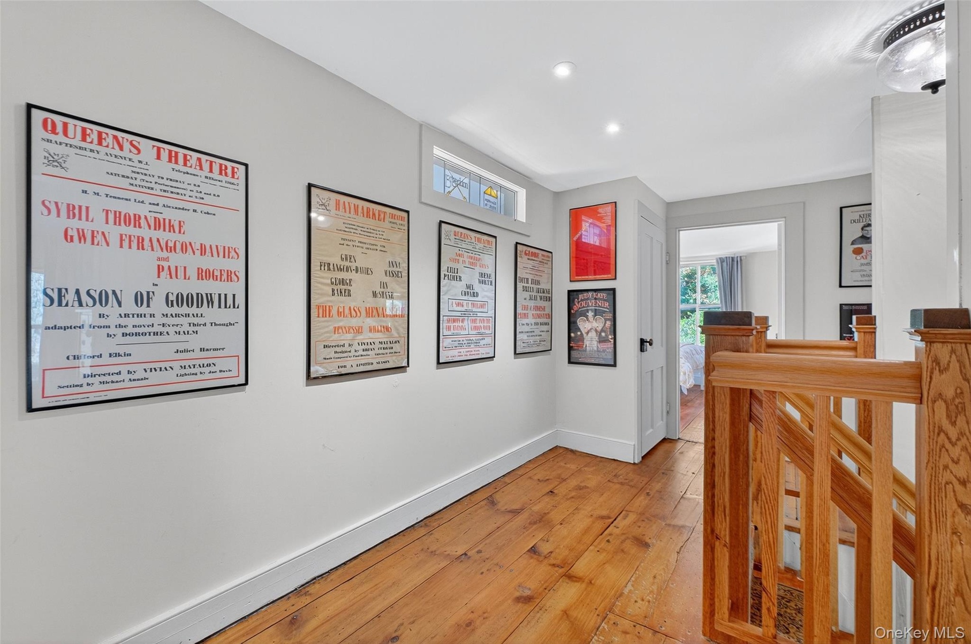 - Hall with an upstairs landing, light wood-style flooring, and recessed lighting