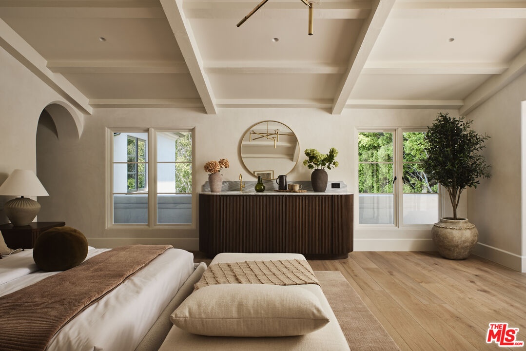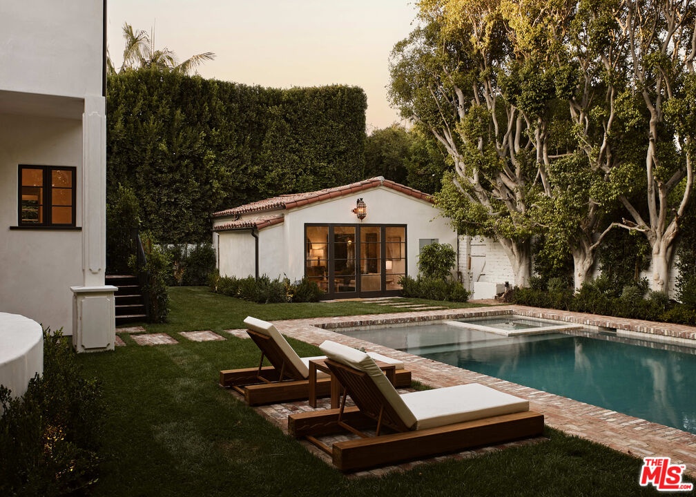 Casa Veleta is a reimagined Spanish jewel created by the renowned luxury home design and build partnership of Aeries Development and AMG. Fresh from a total renovation completed in 2025, classic 1920's details embrace modern day conveniences. Behind a high hedge and past a wrought iron gate, a glamorous fountain and outdoor fireplace invoke historic Montecito. The courtyard sets the stage for a sensory experience beyond. Bathed in light, the entry stair hall and all interior walls are clad in hand-troweled plaster masterfully crafted by artisans. A grand living room with vaulted ceilings is ideal for large-scale entertaining. Elegant formal dining and wine rooms open to an outdoor kitchen and dining area. A gourmet kitchen with oversized marble island and banquette seating opens to a vast terrace and pool beyond. The primary suite is a world apart, with large marble bath, retail quality closet, and a wall of French doors opening to a private terrace with fire feature. Three additional bedrooms (with walk-in closets and en-suite bathrooms) and a common terrace space complete the upper floor. Additional features include a private office (or generous fifth bedroom) with fireplace and full en-suite bathroom, a complete chefs/catering kitchen, a gym/wellness room with sauna that leads directly out to the pool and hot tub, and a gorgeous separate guest villa/ADU. This is an exceptional opportunity to own a piece of living art on the prized 600 block of Arden. Surrounded by important estates, this is hands-down one of the finest locations in Beverly Hills. Casa Veleta is a rare gem for the most discerning buyers.
