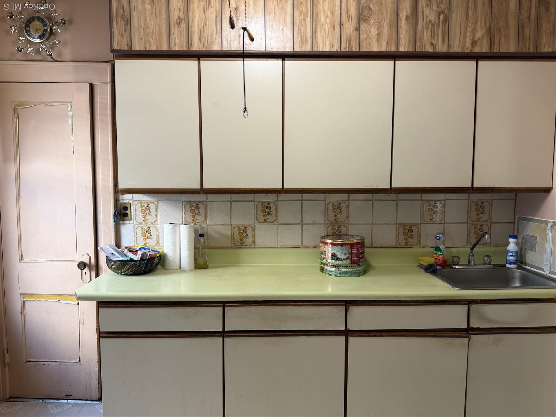 - Kitchen featuring light countertops, tasteful backsplash, and white cabinets