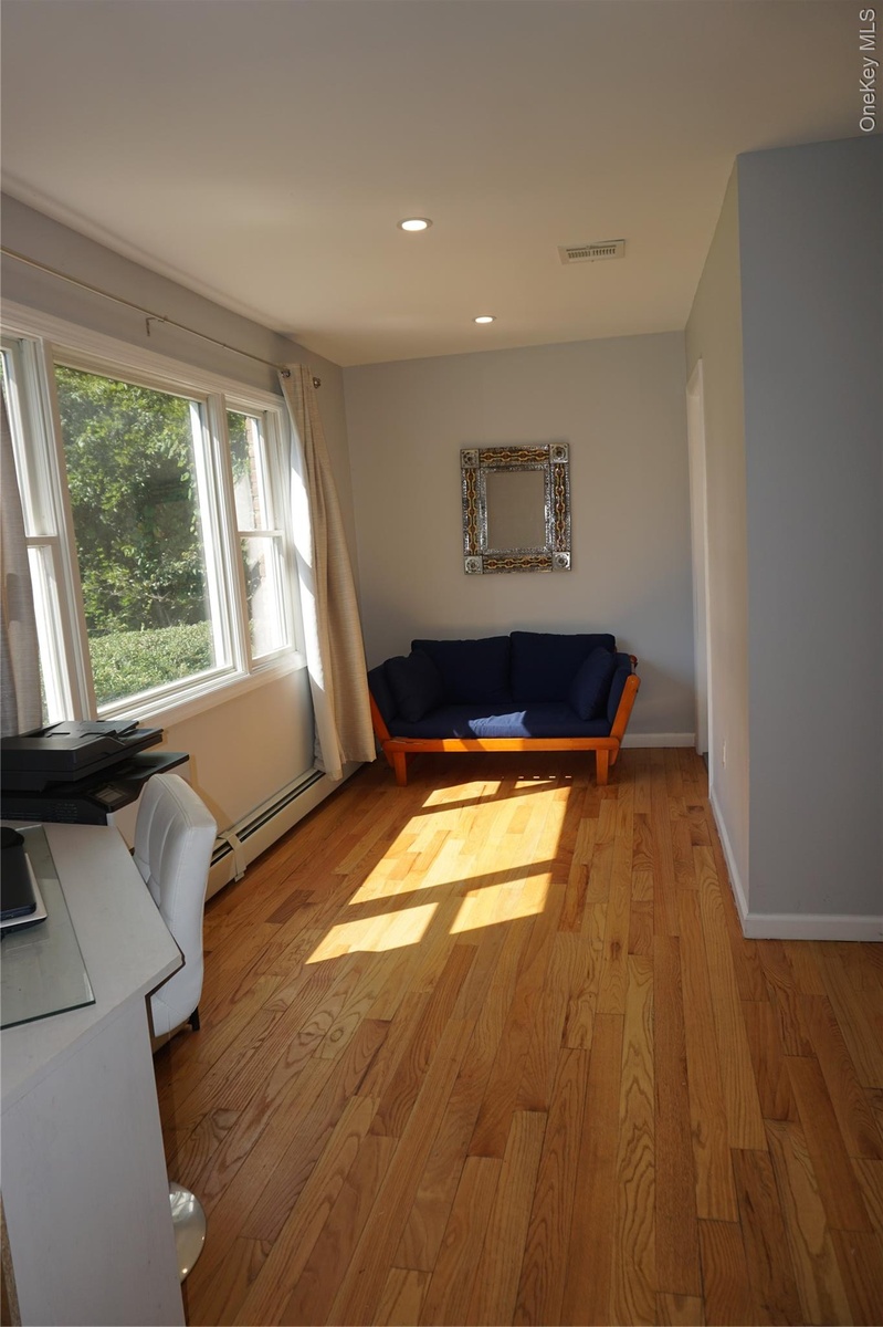 - Living area with light wood-style floors, a baseboard radiator, and recessed lighting