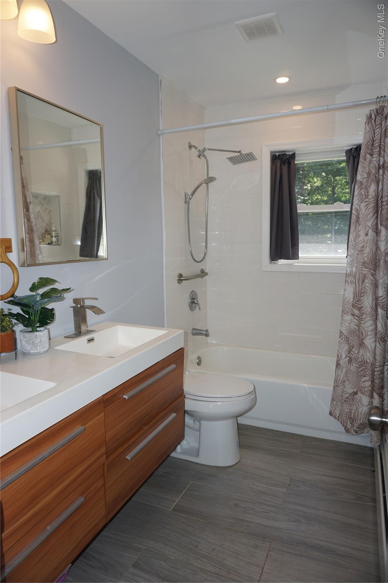 - Bathroom featuring shower / bathtub combination with curtain, double vanity, and recessed lighting