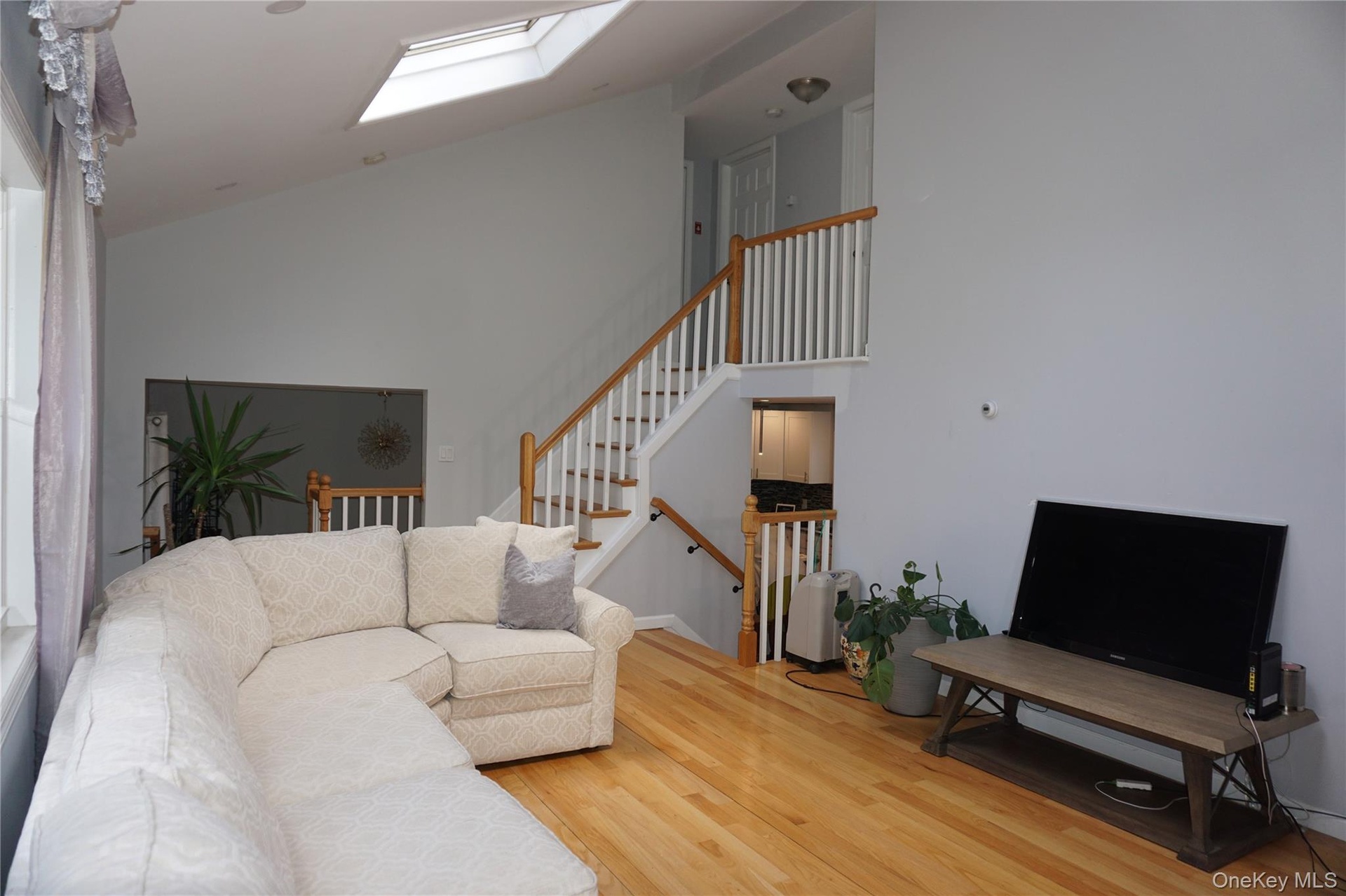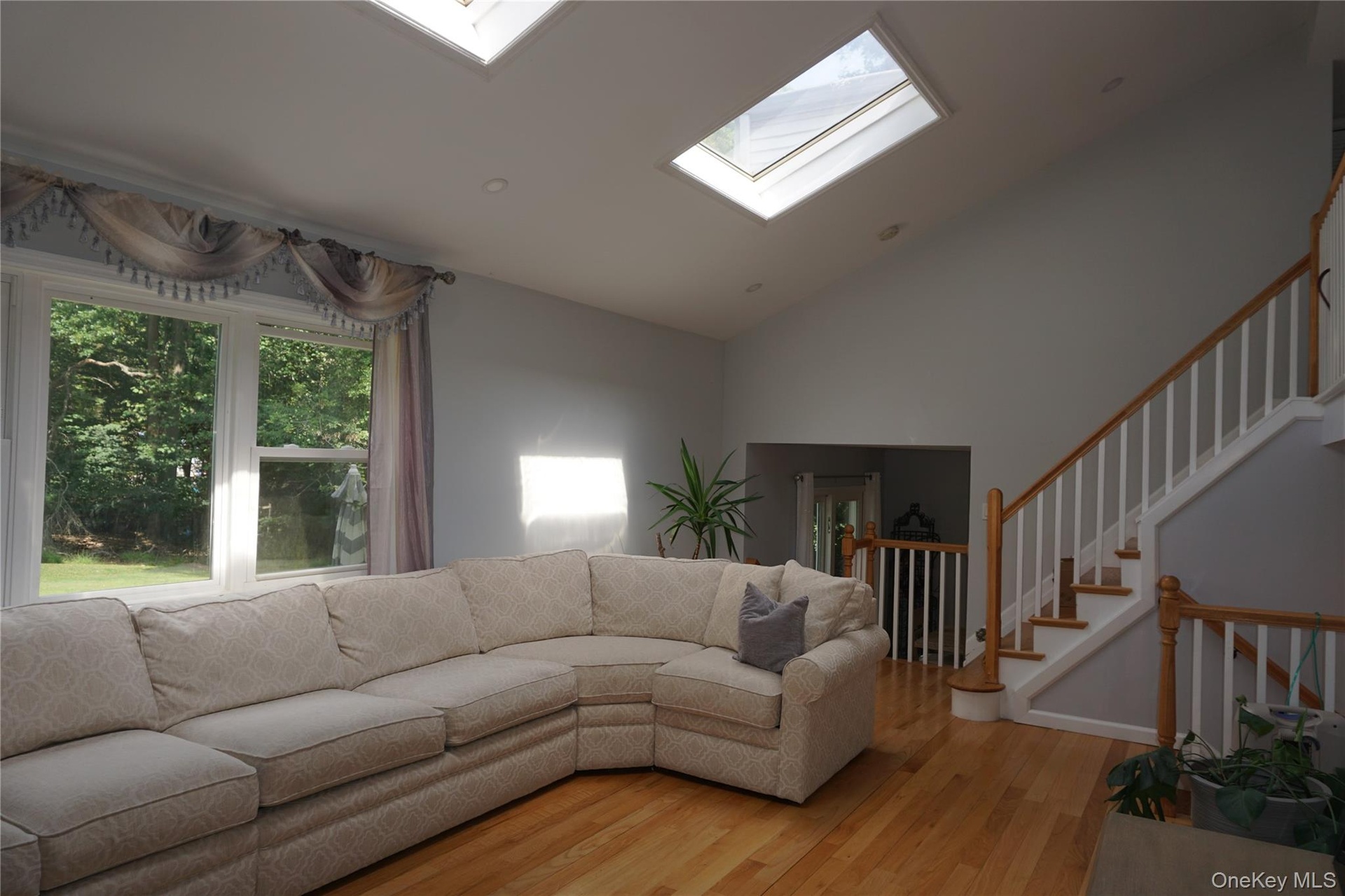 - Living area featuring wood finished floors, a skylight, stairs, and high vaulted ceiling
