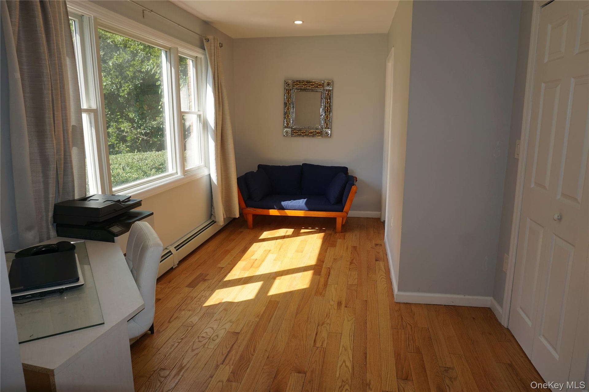 - Living area featuring light wood finished floors, recessed lighting, and a baseboard heating unit