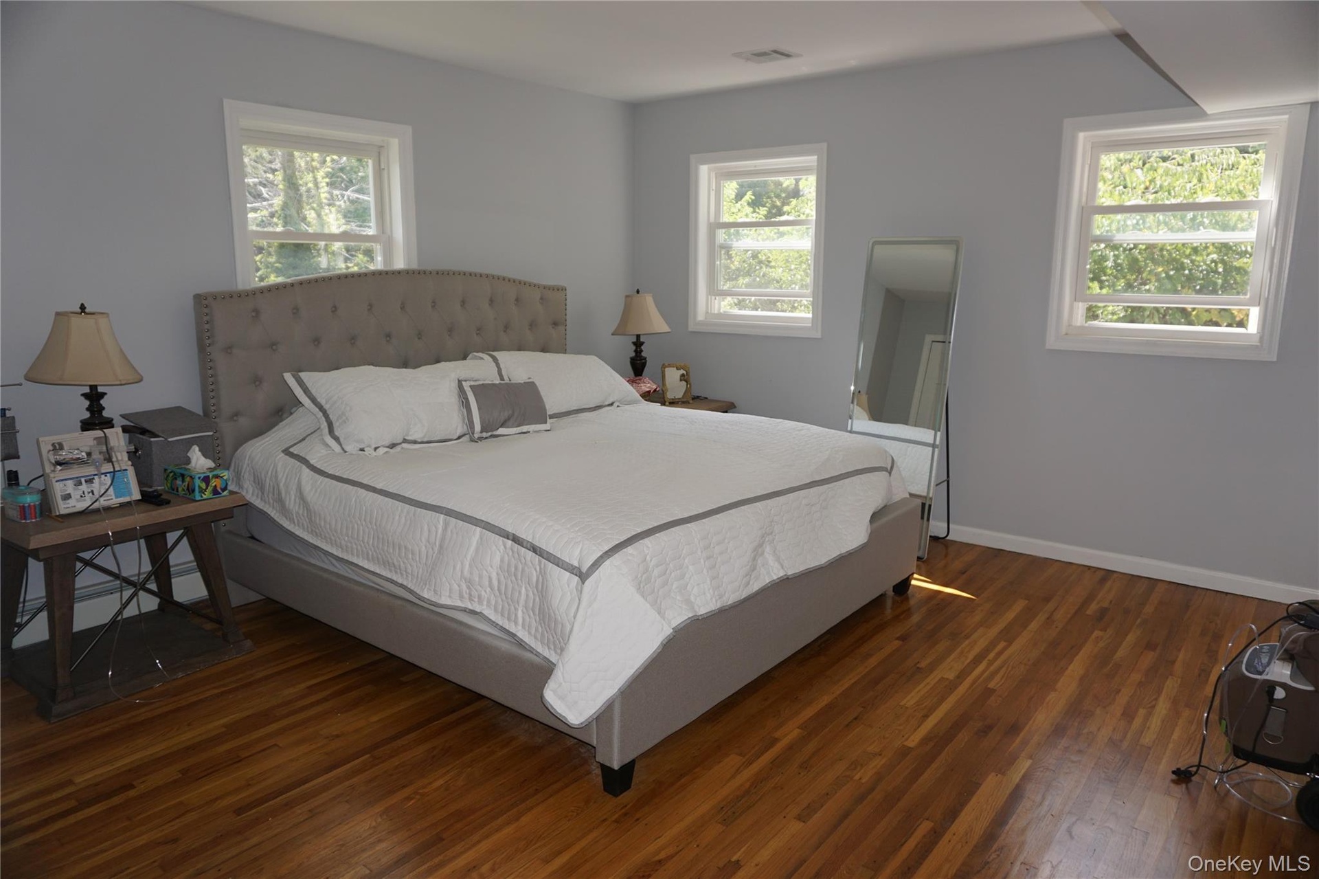 - Bedroom with multiple windows, dark wood-type flooring, and a baseboard heating unit