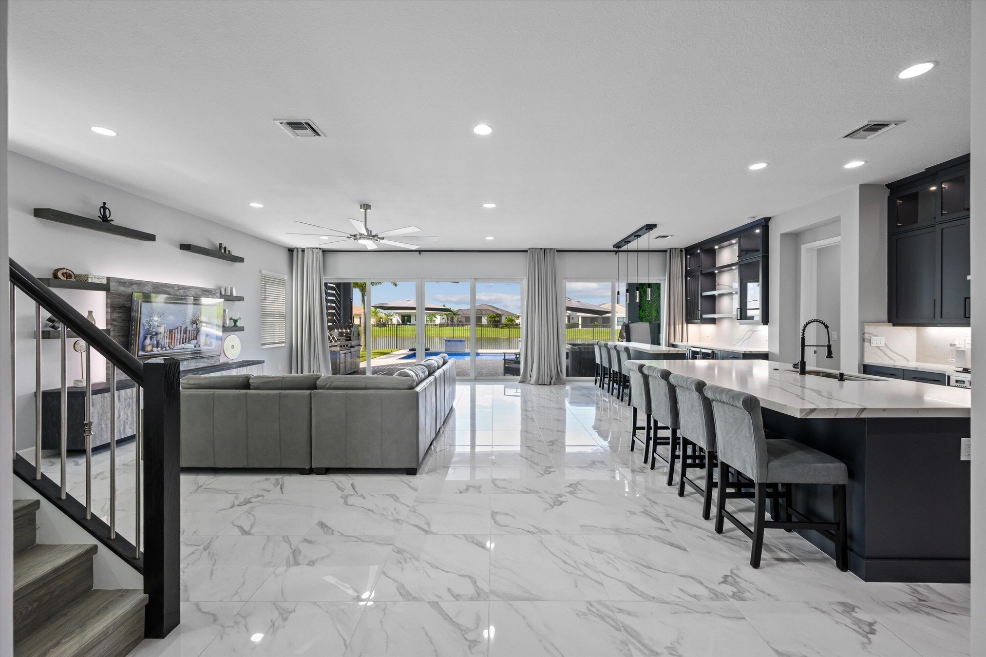 Experience luxury living in this rare, fully furnished Tanager model located in the highly sought-after Orchards of Westlake. This expansive 6-bedroom, 4.5-bath, 4-car garage waterfront residence offers over 5,300 total sq. ft. and shows like a designer model--move-in ready and complete with curated furnishings, artwork, and decor.The gourmet kitchen impresses with a massive island, quartz backsplash, stacked cabinetry, under-cabinet lighting, and premium stainless-steel appliances, including a gas range with hood and three ovens. Spacious living areas include a formal dining room with raindrop chandelier, two dedicated offices, a custom bar with double wine fridge, a coffee station, an upstairs loft, game room, and fitness room.