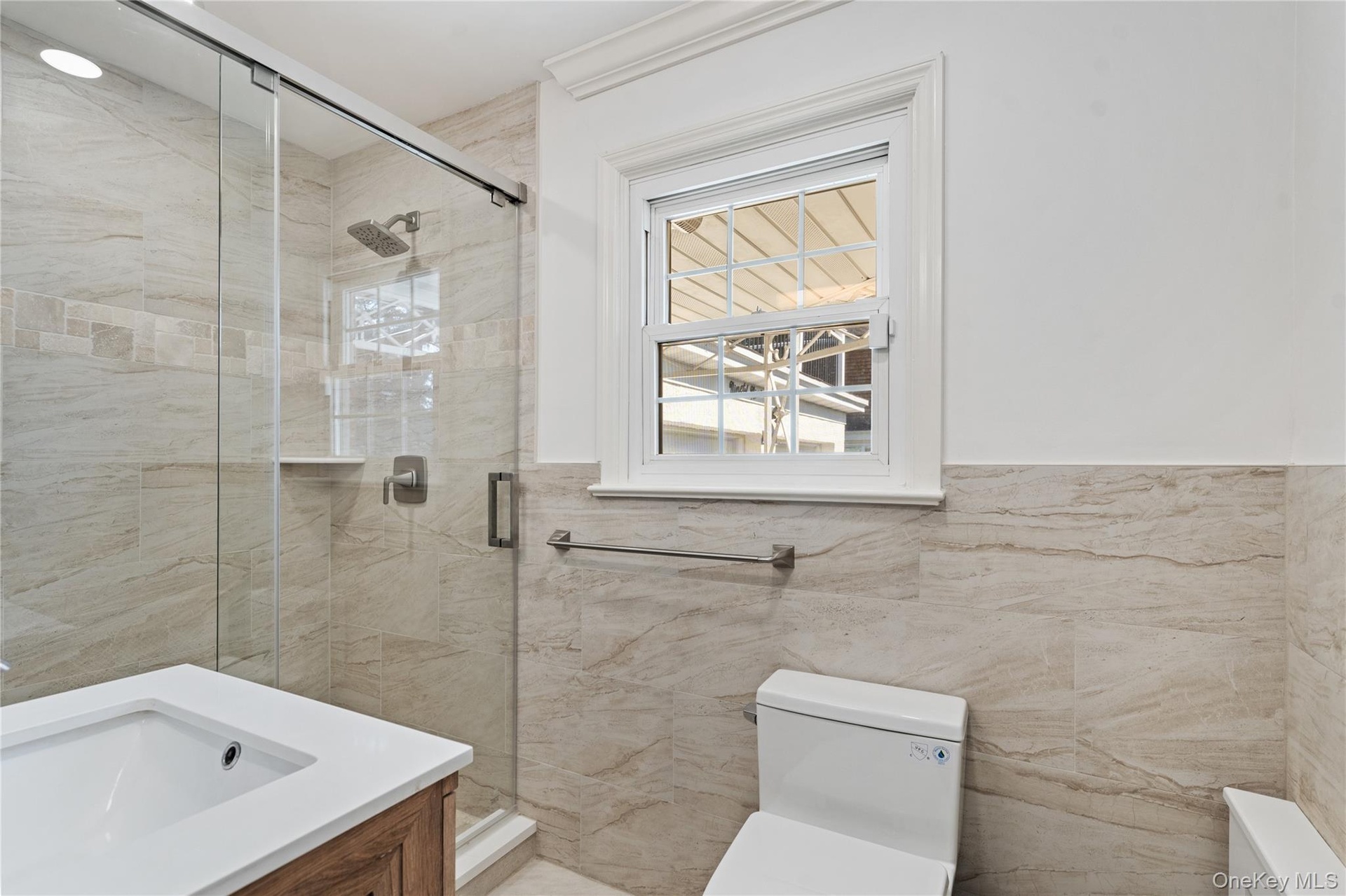 - Full bath featuring ornamental molding, a shower stall, and floor to ceiling tile walls