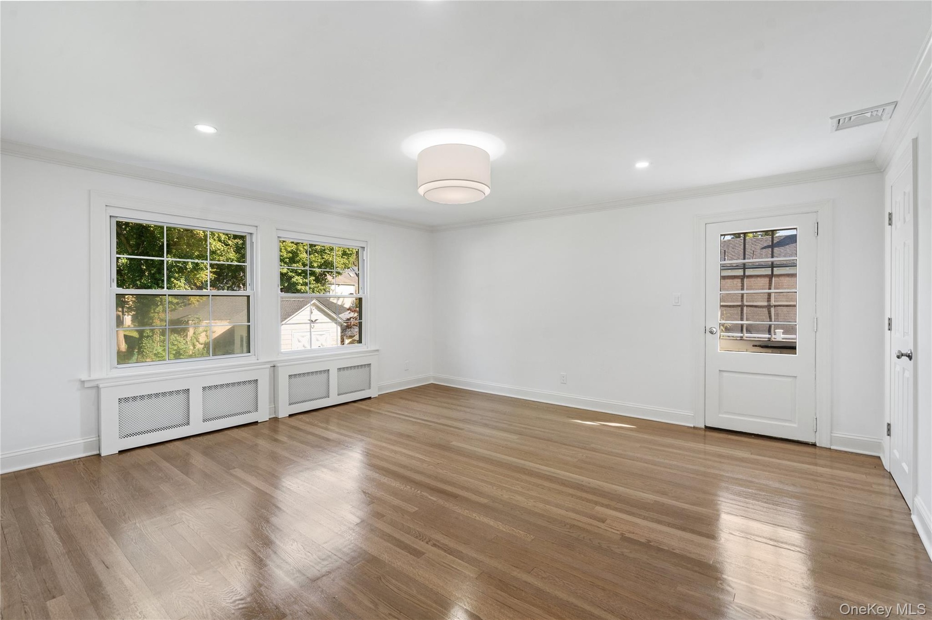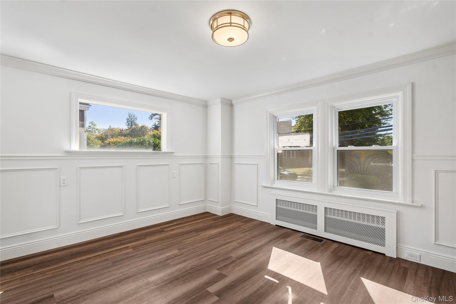 - Empty room featuring radiator, crown molding, and wood finished floors