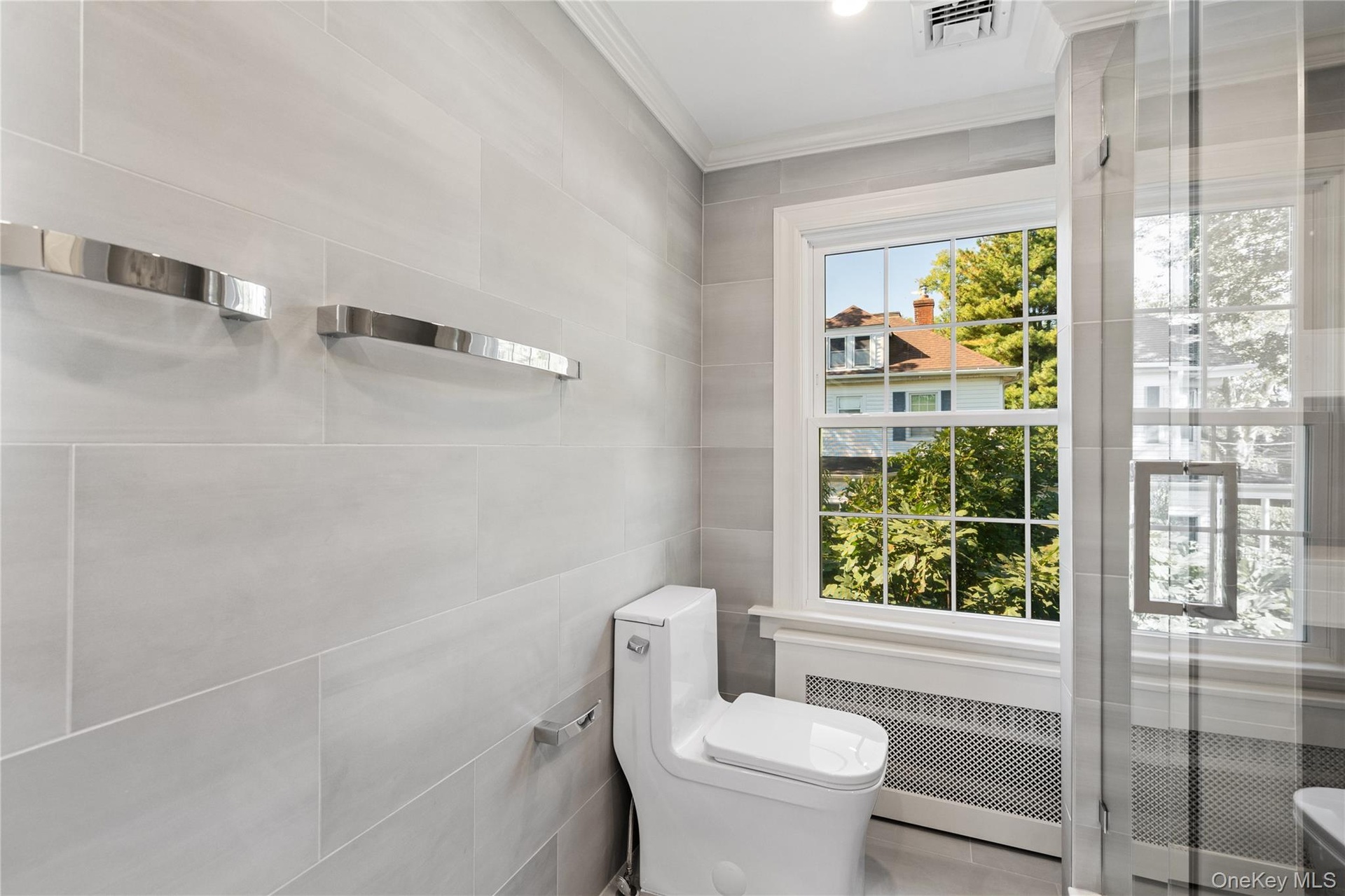 - Bathroom featuring a stall shower, floor to ceiling tile and crown molding