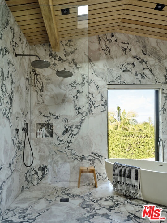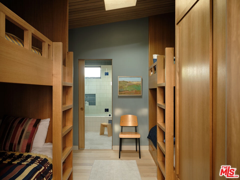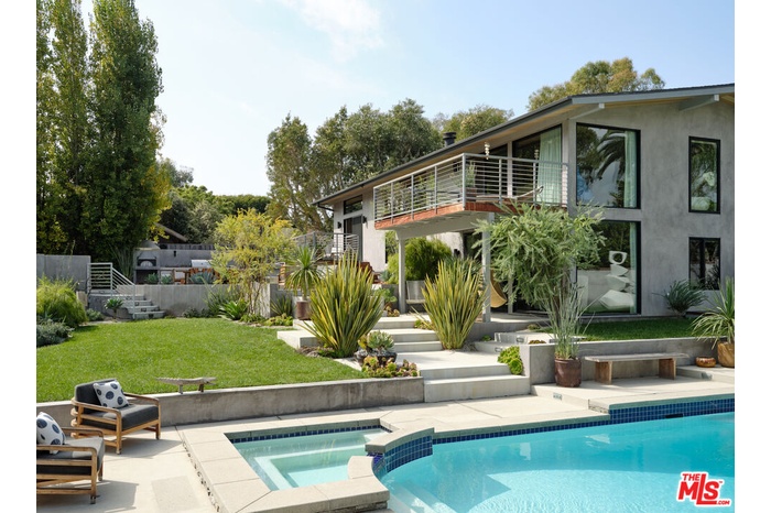 Gorgeously reimagined inside and out, this Point Dume residence has the atmosphere and amenities of a private resort, including a coveted Riviera 2 beach key. Complete with north-south tennis, pool and spa, sports court, outdoor kitchen, and manicured landscaping, this is indoor-outdoor living at its finest. Located behind gates at the end of a private drive, the all en-suite estate has an open, contemporary interior with high, plank-and-beam oak wood ceilings, skylights, art gallery walls, wood floors, and large windows and glass doors opening onto decks, patios, and gardens. The multi-level central living area features a spacious, step-down living room with double-height ceilings, a corner fireplace, and floor-to-ceiling glass with doors to the backyard. Four wide, floating wood steps lead up to the dining area, which features a fossilised stone wet bar, built-in cabinets, and a wall of glass opening onto a back deck. Along with the foyer, also on this level is the kitchen, a culinary masterpiece with beautiful fossilised honed stone countertops, a large island with bar seating, top-of-the-line appliances, and expansive walnut pantry cabinets. Off the entry, steps lead down to the den/media room, which has doors to both the front and back yards. A beautiful skylight office features a custom walnut live-edge built-in desk. The first of the home's five en-suite bedrooms is a bunk room, with four built-in oak bunks and a built-in desk. A half-flight up from the foyer is a hallway with two bedrooms, including the primary suite, which has wraparound windows, a private deck overlooking the backyard and pool, and a dramatic marble and heath tile skylight bath with a pool-view stone tub. Steps down from the living room are two more en-suite bedrooms, both opening to the backyard, one with a covered patio just outside. The property is open and yet exceedingly private. At the front of the house, where there is ample room for guest parking, there is an entry courtyard garden with two decks. The back of the property provides an appealing array of settings for entertaining, lounging, and recreation, including an outdoor kitchen with a pizza oven, Lynx barbecue, and adjacent al fresco dining area. Decks and a wide back lawn offer ideal spots for watching tennis, and the pool has a huge sun deck plus another large lawn that extends along the side of the house. The home's additional features include a powder room, a large laundry room, and a hidden surfboard storage under the deck. This serene and majestic residence is a private and luxurious enclave on ultra-desirable Point Dume.
