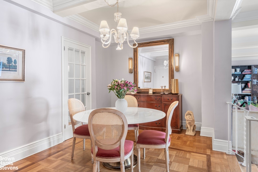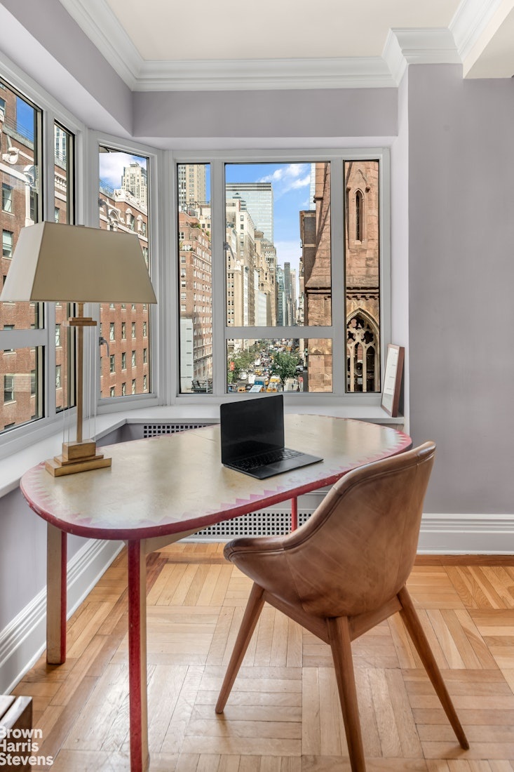 The Madison Avenue corner apartments in the building are coveted for their views of the famous thoroughfare and from the ninth floor the view is further enhanced by the city skyline and the spire of the landmarked Church of the Incarnation.
