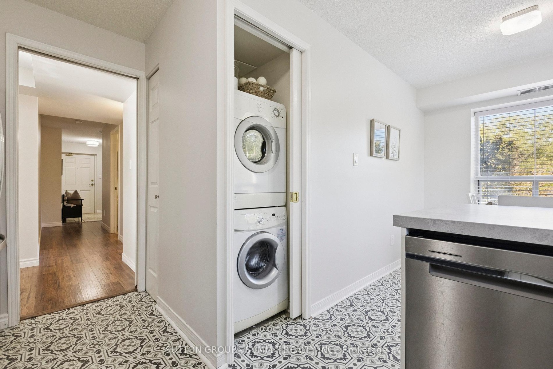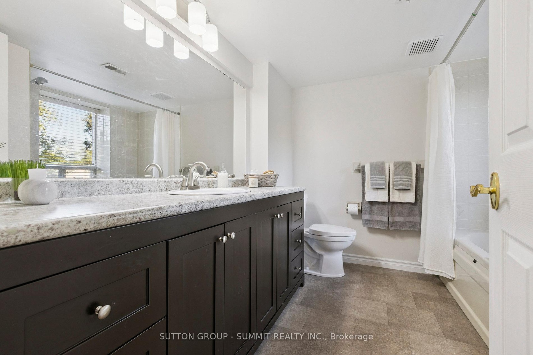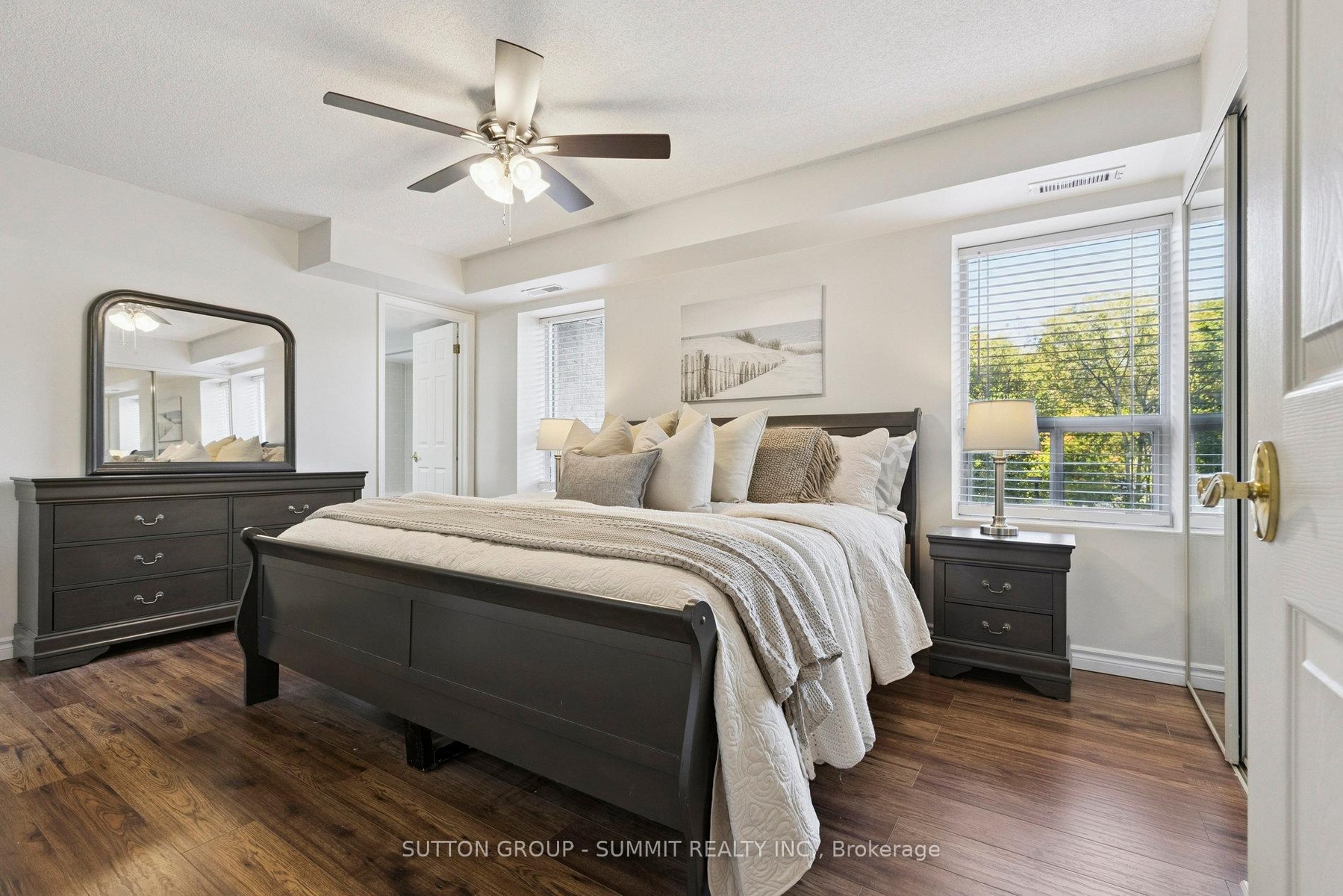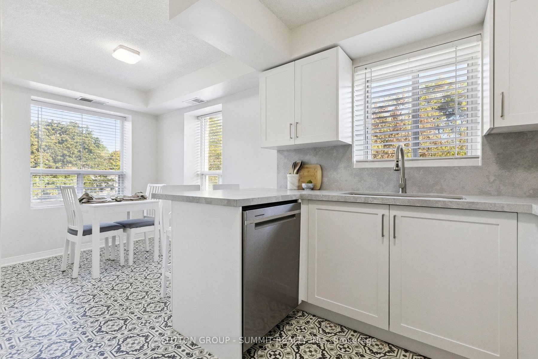 Welcome to this gorgeous renovated corner unit, 2+1 bedroom, 2 bathroom suite at the highly sought-after Parkview Terrace. Offering Over 1,200 sq. ft. of bright boutique-style living, this spacious home is set within one of Guelph's most charming low-rise condominiums. With only four suites per floor, residents enjoy exceptional privacy and a strong sense of community. A welcoming foyer with a large double closet sets the tone for this professionally renovated home. Painted throughout in a soft neutral enhances the home's bright, open, airy flow. The sunlit primary bedroom features 2 large windows, 2 generous closets, a private 4 piece ensuite with a tub/shower, and a large vanity. The second bedroom offers ample space and natural light, with easy access to a newly upgraded second bath, showcasing a modern tiled shower, new vanity plus a pocket door to a storage room. The stunning new kitchen is designed for both form and function, complete with modern cabinetry, stainless steel appliances, breakfast bar, gorgeous quartz counters and seamless quartz backsplash, plus an eat-in dining area. In-suite laundry is conveniently tucked away. The living and dining area offers a perfect space for families or those who love to entertain. The private office/den with pocket doors creates an ideal quiet space or 3rd bedroom, a rare 2+1 find. The abundance of windows flood the home with natural light all day. This corner unit offers 2 beautiful exposures with morning and evening sun and a private balcony with a peaceful, tree surrounding. Additional highlights include a sauna, gym and party room. Ideally located close to Hwy's and minutes from downtown Guelph's vibrant cafes, shops, farmers' market, restaurants, trails, and dog parks, with easy access to the Hanlon Expressway, this home offers an exceptional blend of comfort, space, and convenience.