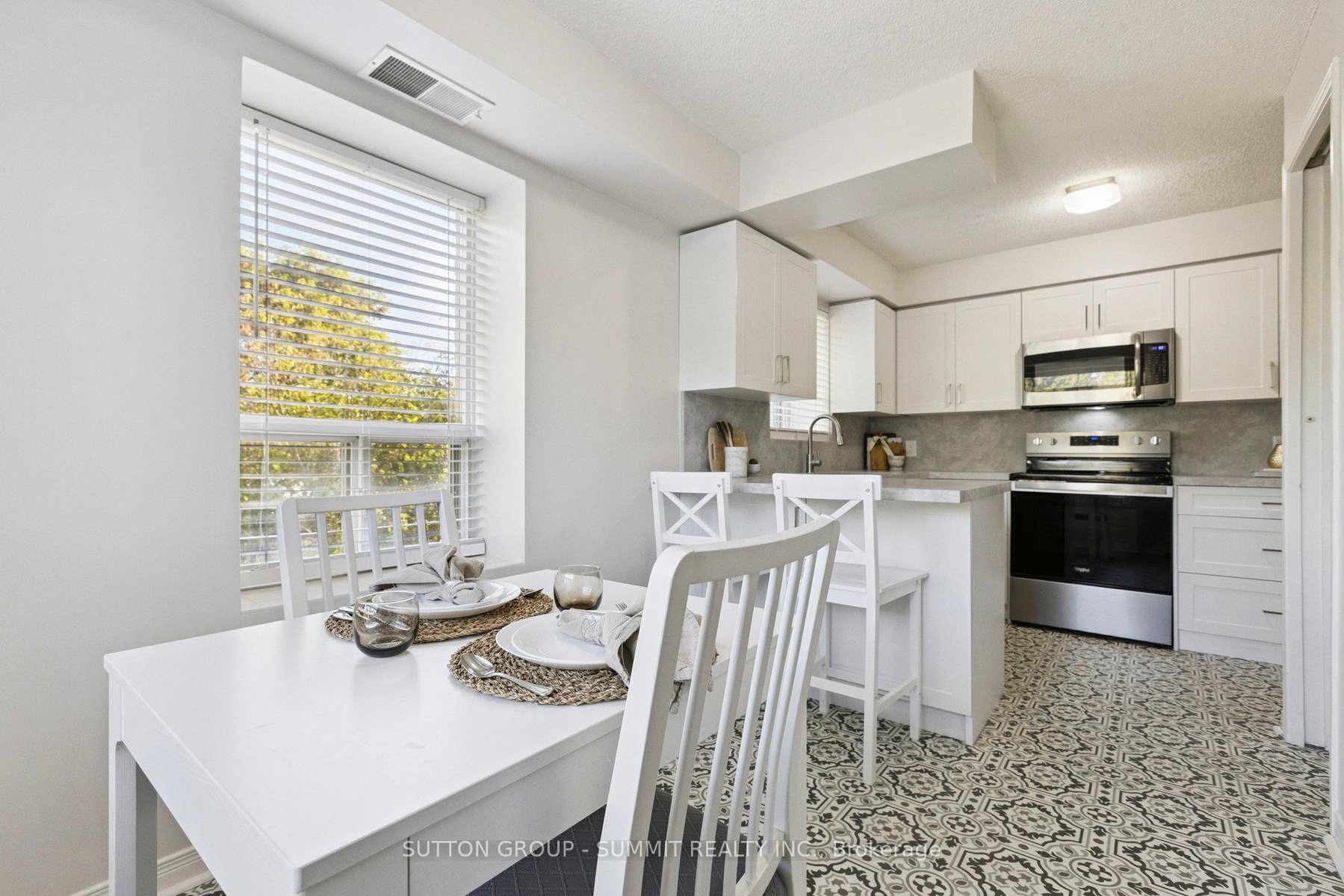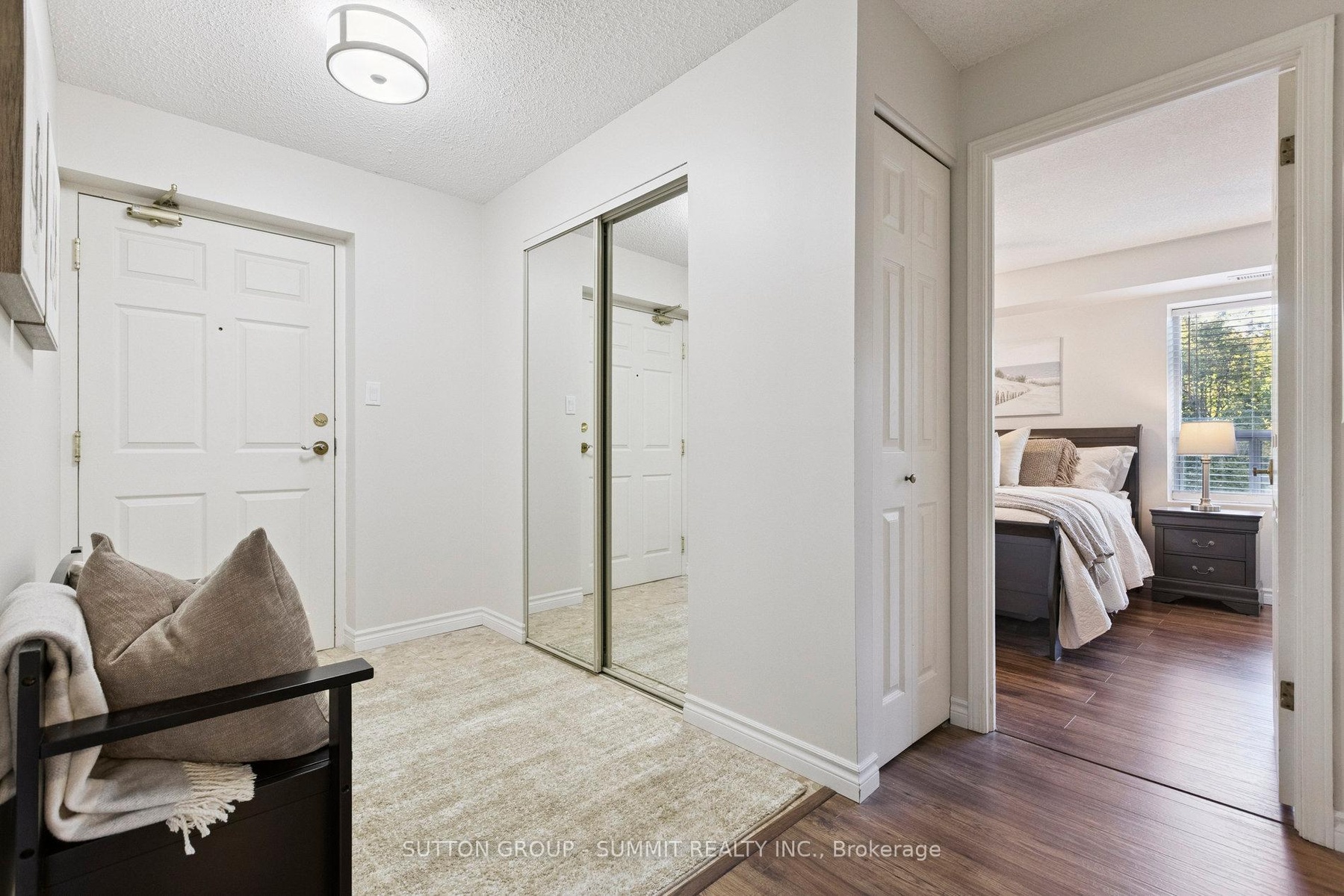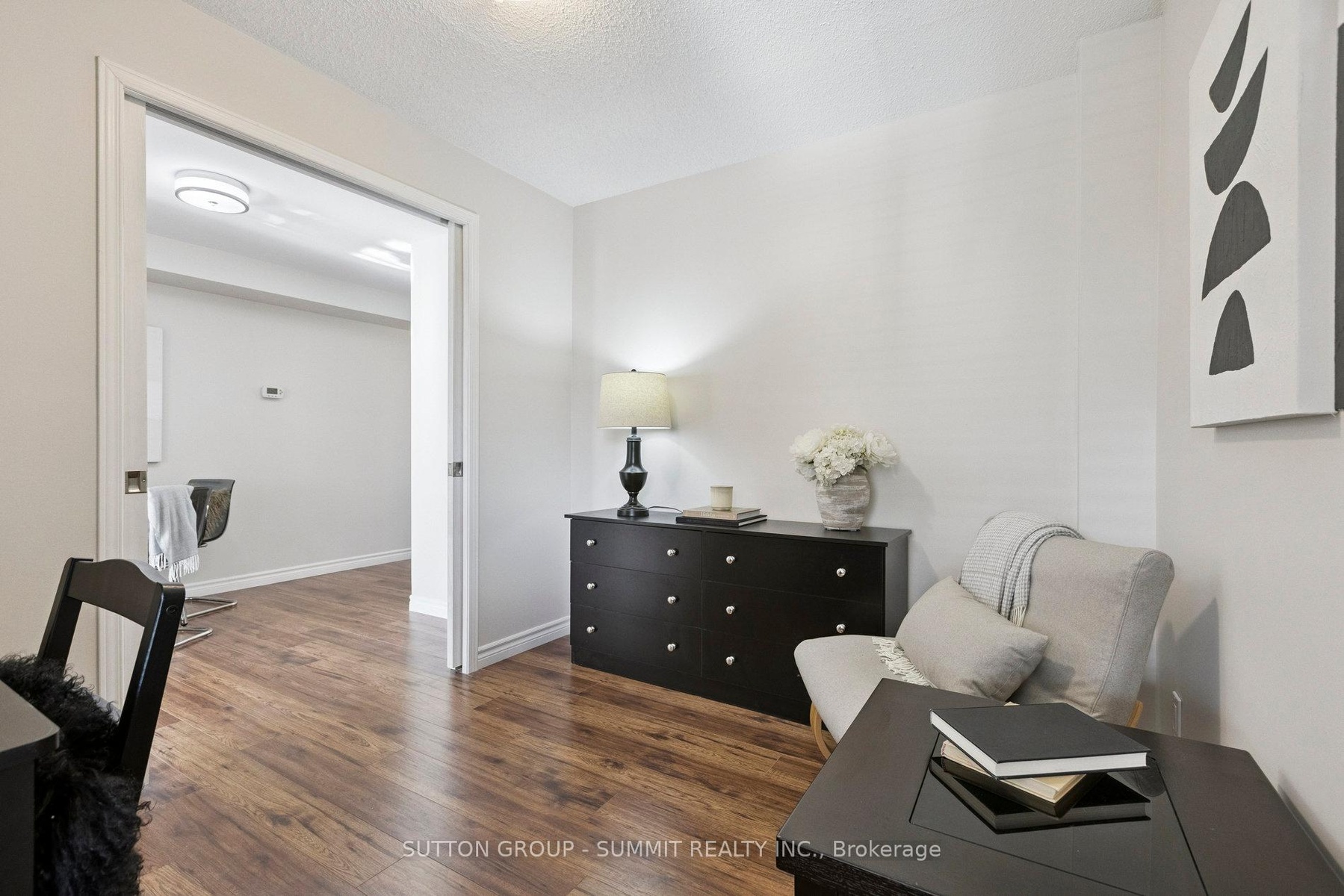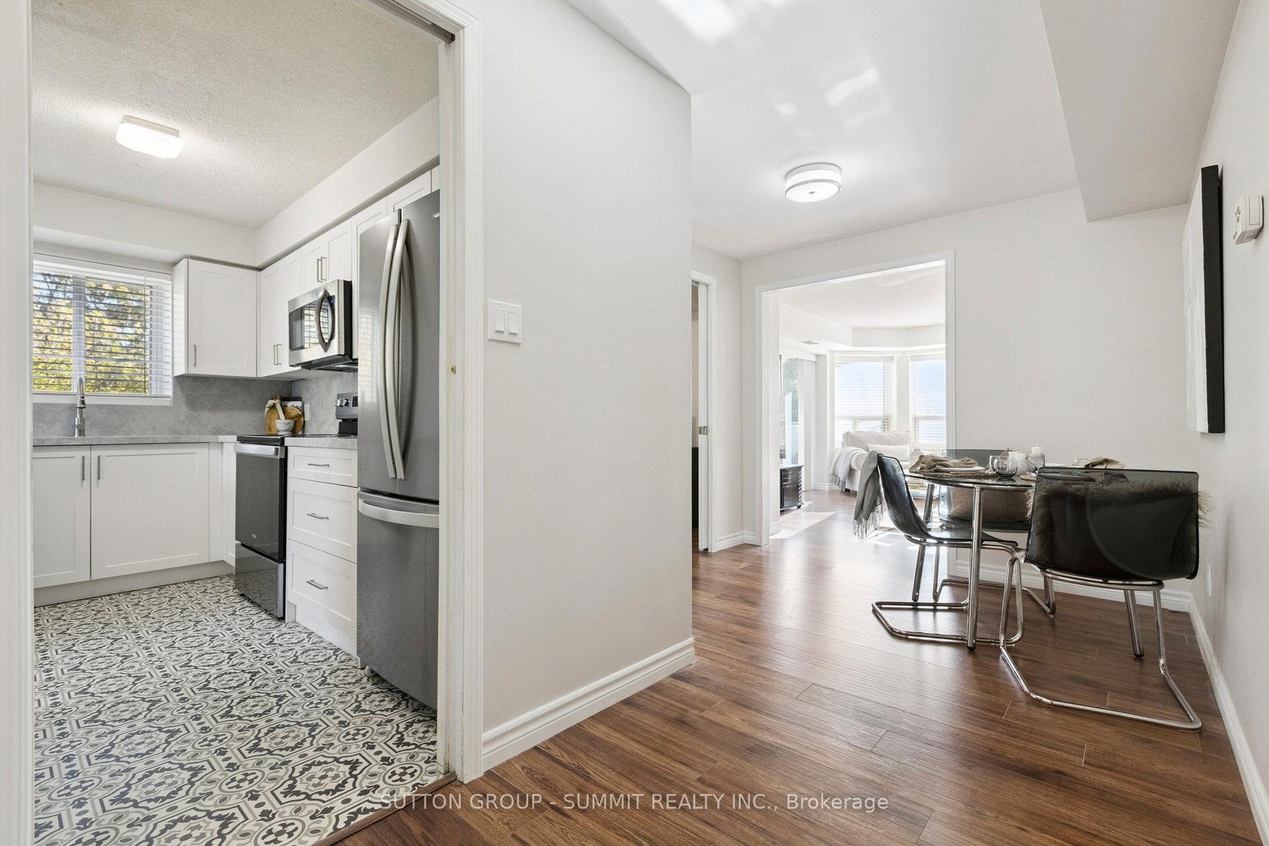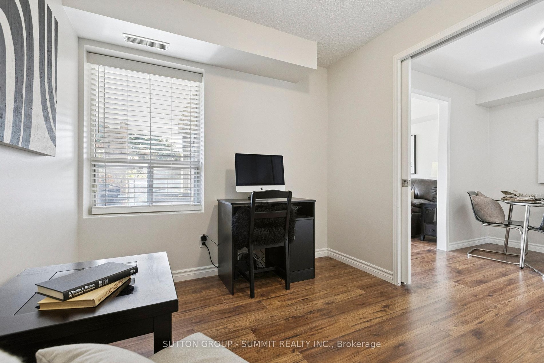 Welcome to this gorgeous renovated corner unit, 2+1 bedroom, 2 bathroom suite at the highly sought-after Parkview Terrace. Offering Over 1,200 sq. ft. of bright boutique-style living, this spacious home is set within one of Guelph's most charming low-rise condominiums. With only four suites per floor, residents enjoy exceptional privacy and a strong sense of community. A welcoming foyer with a large double closet sets the tone for this professionally renovated home. Painted throughout in a soft neutral enhances the home's bright, open, airy flow. The sunlit primary bedroom features 2 large windows, 2 generous closets, a private 4 piece ensuite with a tub/shower, and a large vanity. The second bedroom offers ample space and natural light, with easy access to a newly upgraded second bath, showcasing a modern tiled shower, new vanity plus a pocket door to a storage room. The stunning new kitchen is designed for both form and function, complete with modern cabinetry, stainless steel appliances, breakfast bar, gorgeous quartz counters and seamless quartz backsplash, plus an eat-in dining area. In-suite laundry is conveniently tucked away. The living and dining area offers a perfect space for families or those who love to entertain. The private office/den with pocket doors creates an ideal quiet space or 3rd bedroom, a rare 2+1 find. The abundance of windows flood the home with natural light all day. This corner unit offers 2 beautiful exposures with morning and evening sun and a private balcony with a peaceful, tree surrounding. Additional highlights include a sauna, gym and party room. Ideally located close to Hwy's and minutes from downtown Guelph's vibrant cafes, shops, farmers' market, restaurants, trails, and dog parks, with easy access to the Hanlon Expressway, this home offers an exceptional blend of comfort, space, and convenience.