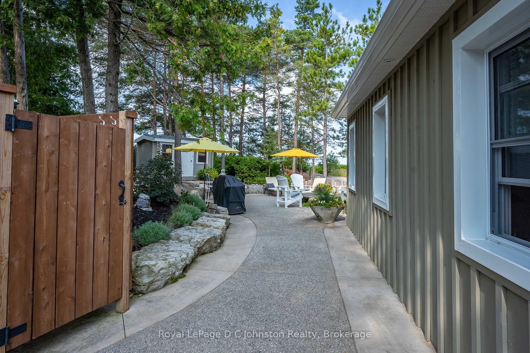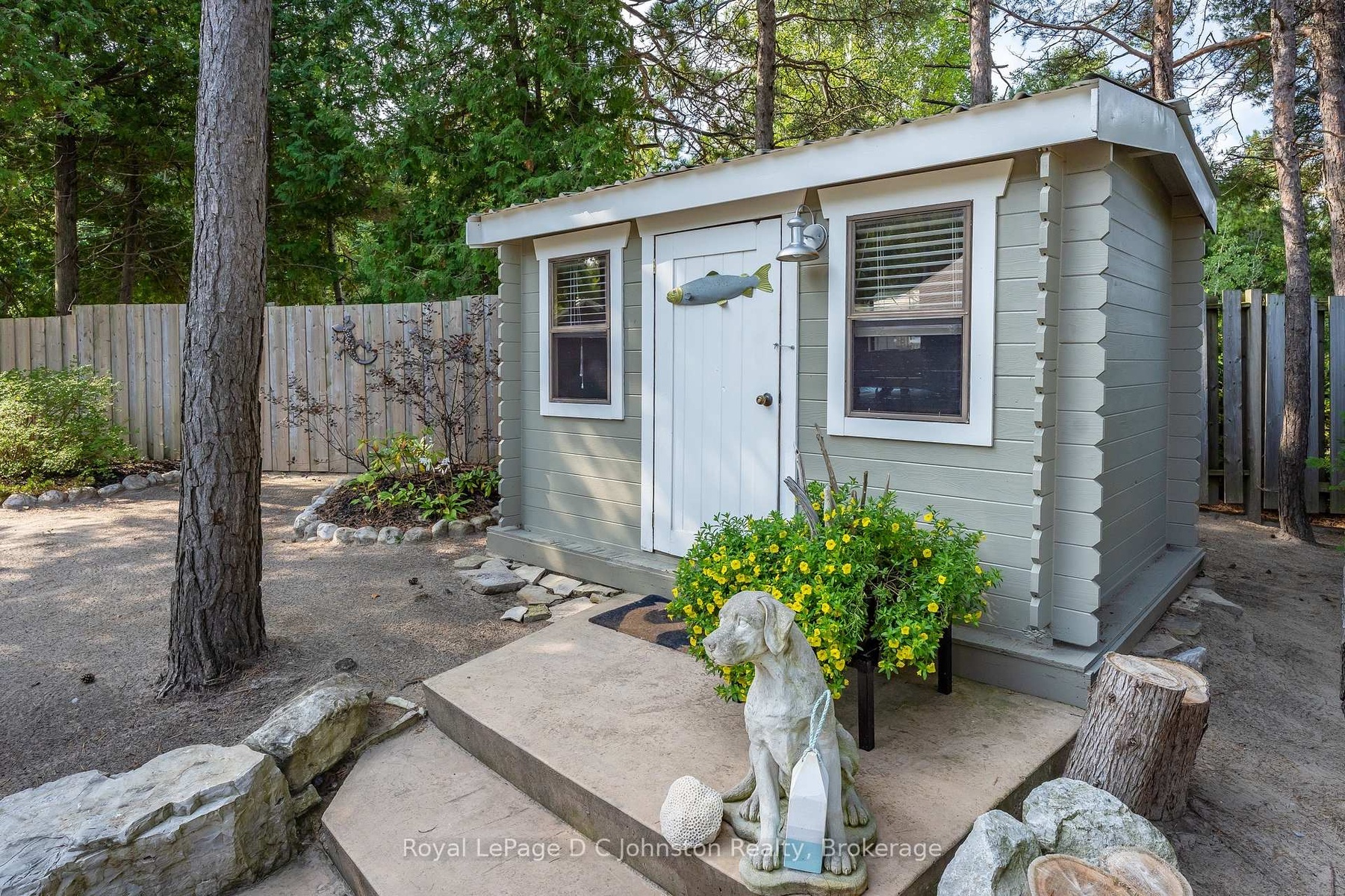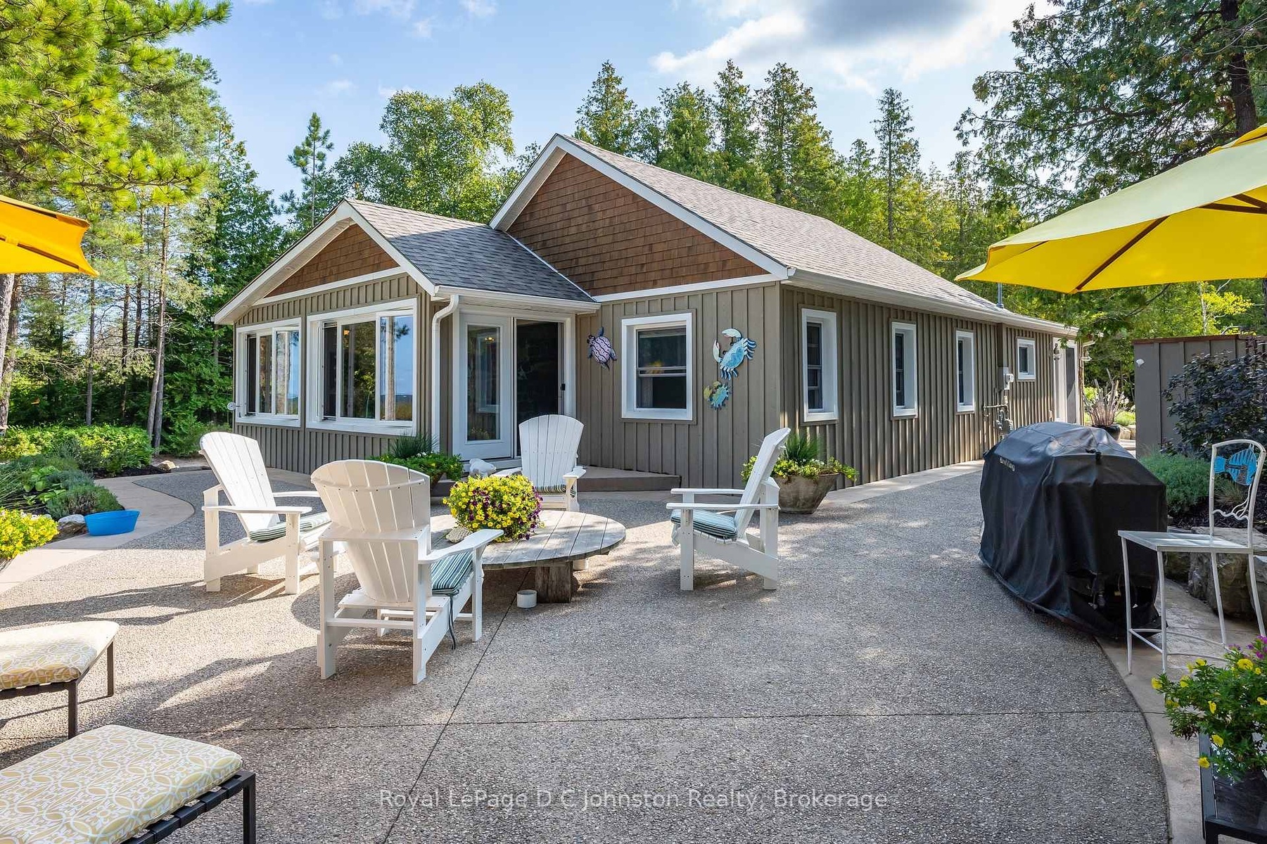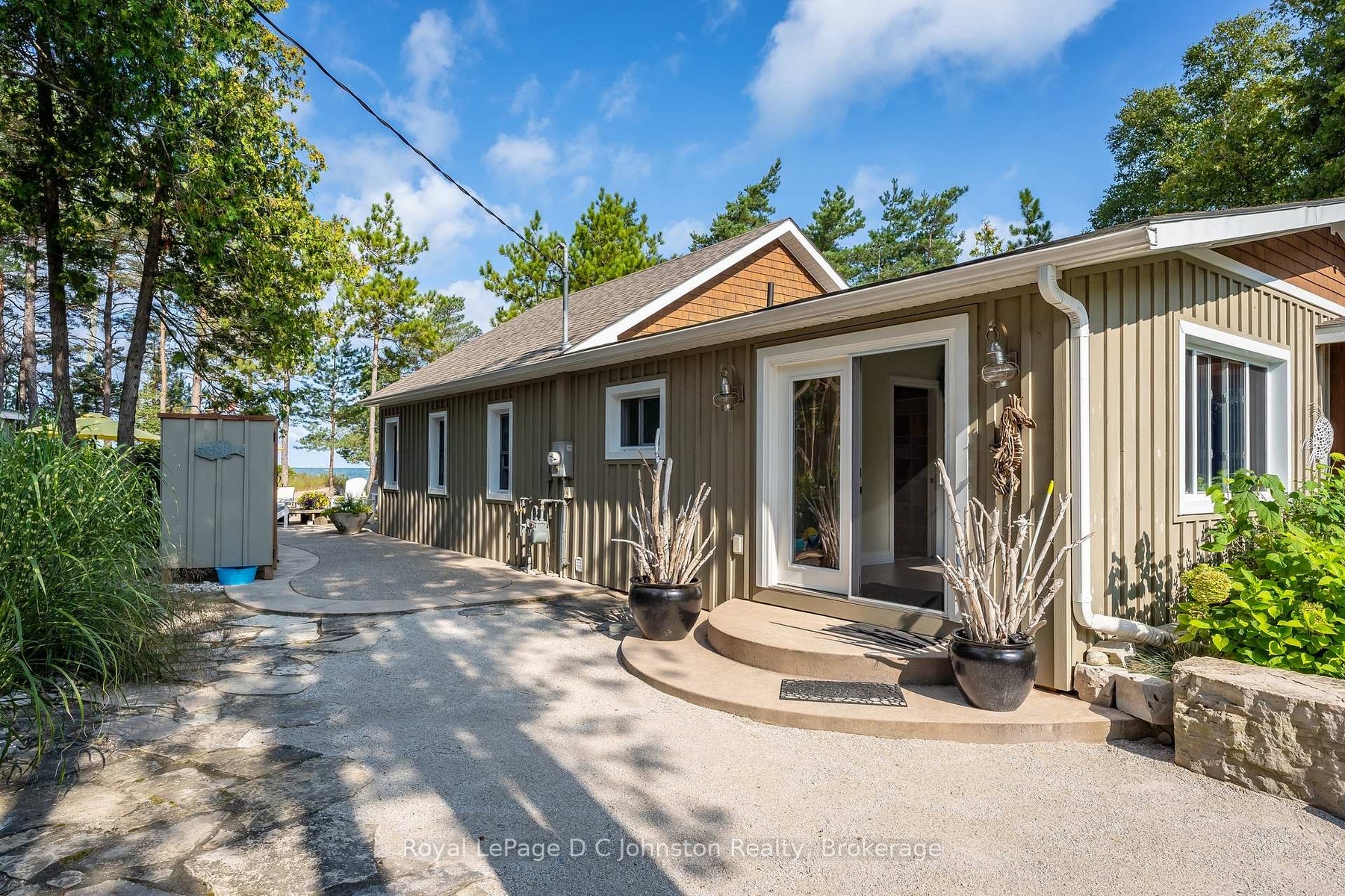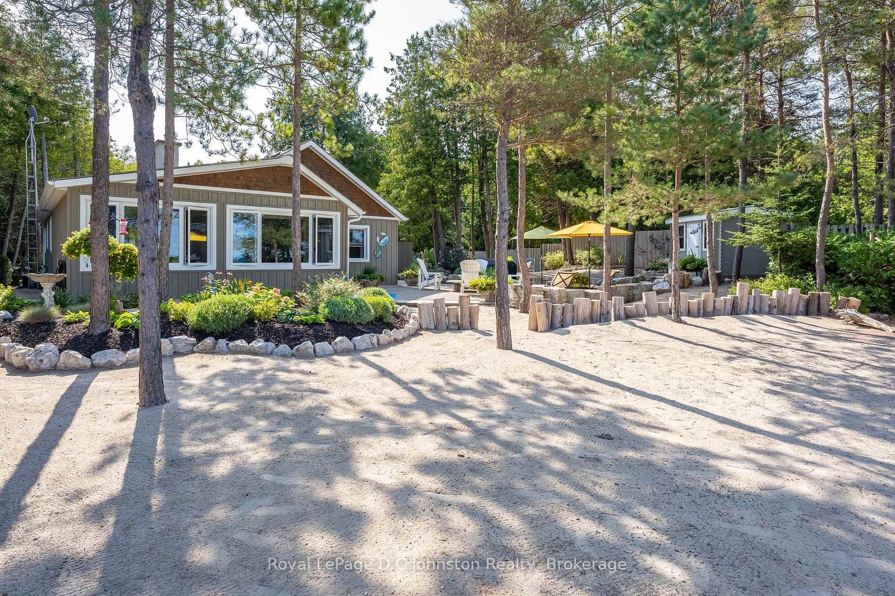 Dream Beachfront Retreat in Port Elgin. This is an unparalleled opportunity to own a piece of Saugeen Beach Road's coveted shoreline, nestled in the trees along the enclave known locally as Eidt's Grove. This property boasts a generous 111 foot frontage of sandy Lake Huron shoreline, offering spectacular panoramic views and sunsets. The large, private lot is a natural oasis, featuring a charming babbling stream that meanders through the property. The fully renovated 1,800 square foot year-round home or vacation hideaway (fully updated in 2010) is designed for comfort and style. Inside, the home is anchored by a rustic stone fireplace in the main living area, complemented by engineered hickory wood floors and a bright, functional kitchen featuring whitewashed poplar cabinetry, a large island, and stainless steel appliances. With three bedrooms, a large entrance foyer, and a main-floor laundry room, this home is as practical as it is beautiful. Step outside to exceptional outdoor living spaces, including stunning exposed aggregate concrete walkways and patios that lead directly to the white sand beach. The property is complete with an oversized, detached 24 x 30 foot insulated garage/workshop, a woodshed, a 7 x 11 foot bunkie, and a refreshing outdoor shower, making this a truly turn-key lakefront gem.